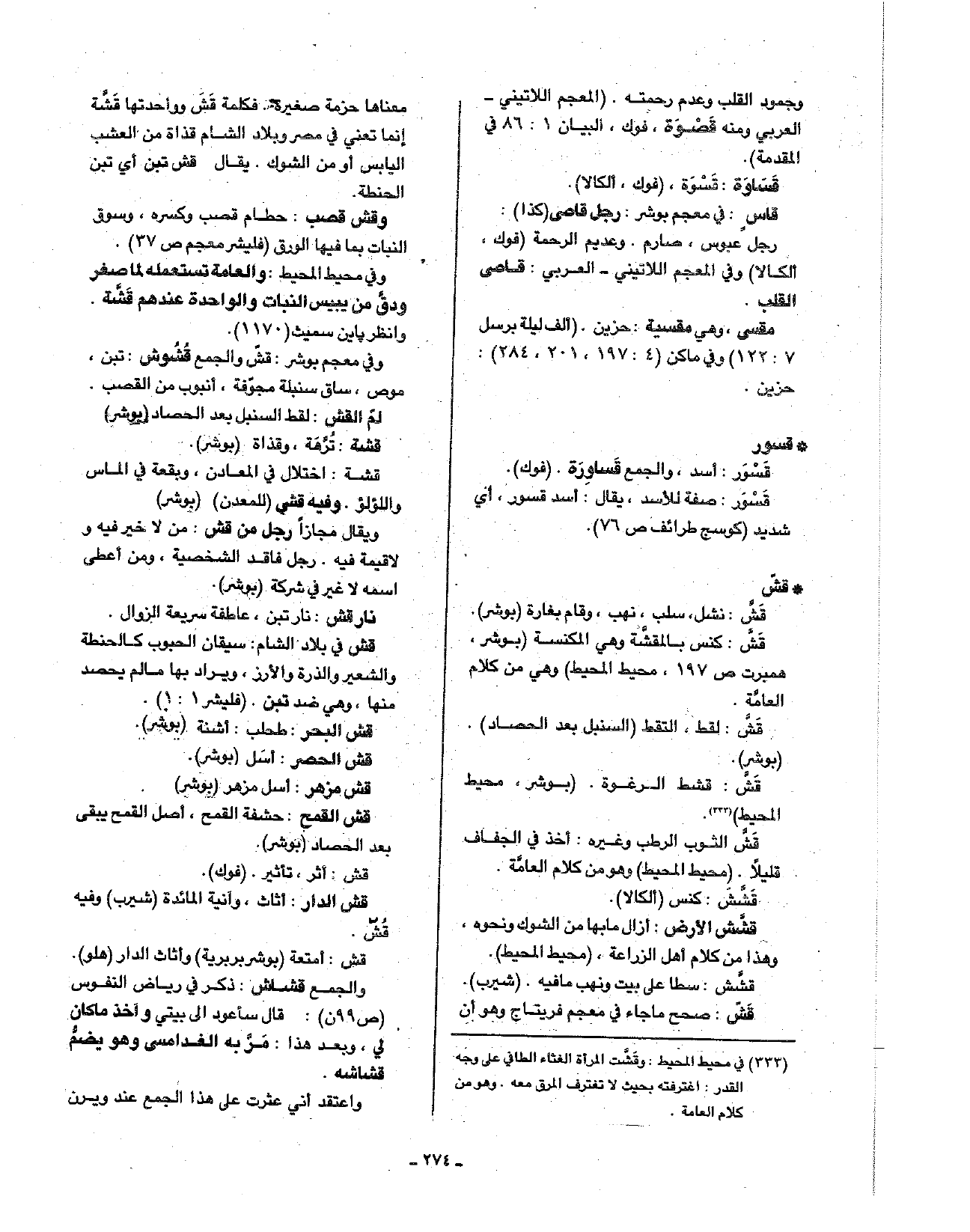 قش: صحح ما جاء في معجم فريتاج وهو أن معناها حزمة صغيرة. فكلمة قش وواحدتها قشة إنما تعني في مصر وبلاد الشام قذاة من العشب اليابس أو من الشوك. يقال قش تبن أي تبن الحنطة.