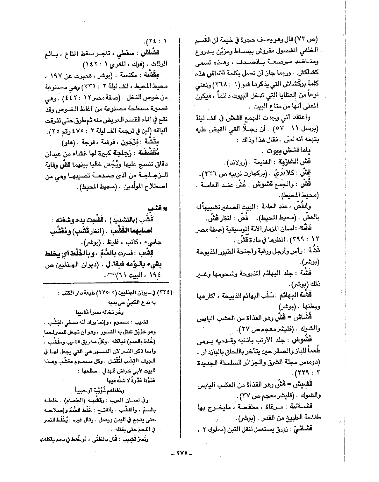 (ص 73) قال وهو يصف حجرة في خيمة أن القسم الخلفي المفصول مفروش ببساط ومزين بدروع ومناضد مرصعة بالصدف، وهذه تسمى كشاكش. وربما جاز أن نصل بكلمة قشاش هذه كلمة بوكشاش التي يذكرها شو (1: 268) ونعني نوعا من العظايا التي تدخل البيوت دائما، فيكون المعنى إنها من متاع البيت.