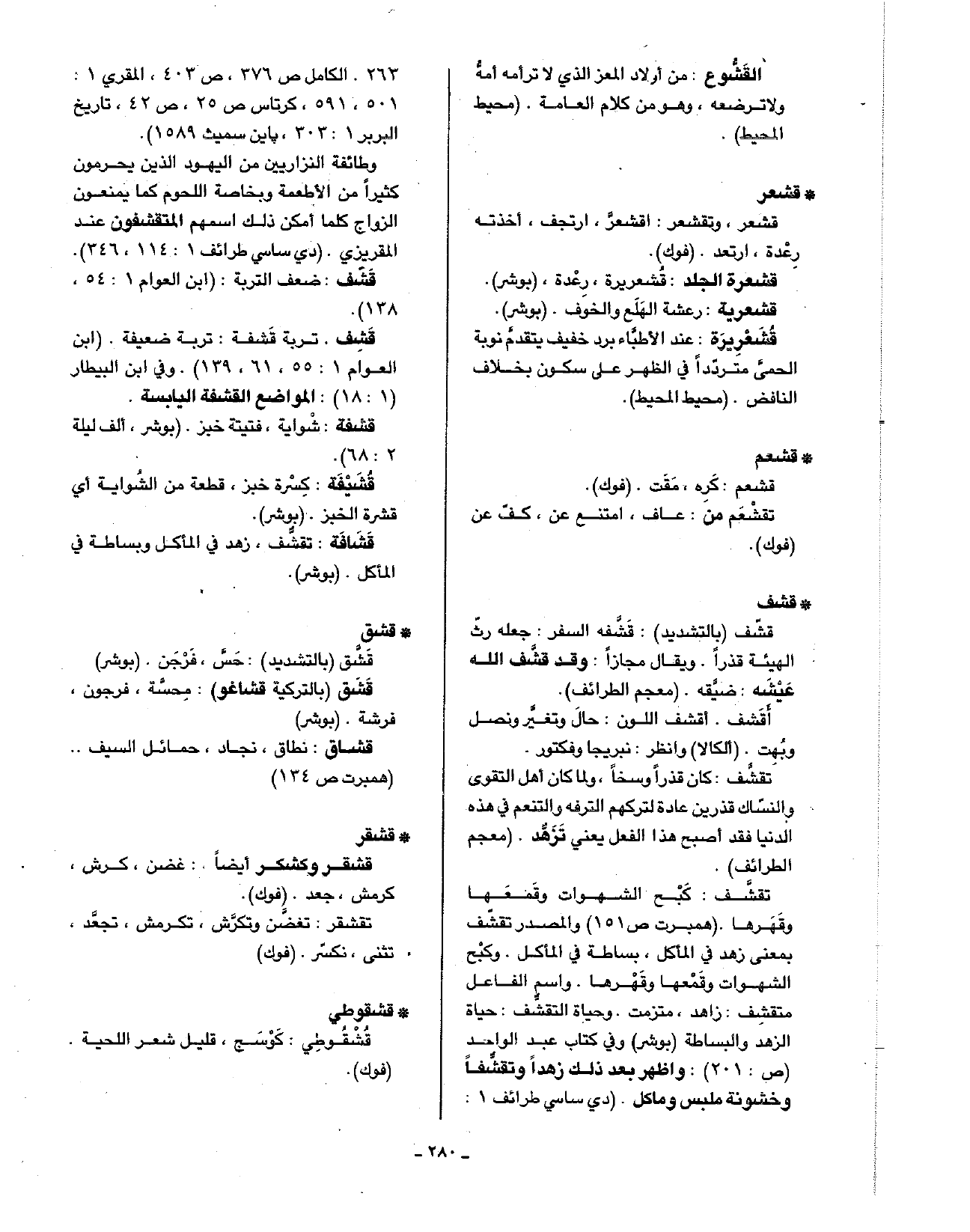 • قشف: قشف (بالتشديد): قشفه السفر: جعله رث الهيئة قذرا. ويقال مجازا: وقد قشف الله عيشه: شيقه. (معجم الطرائف).