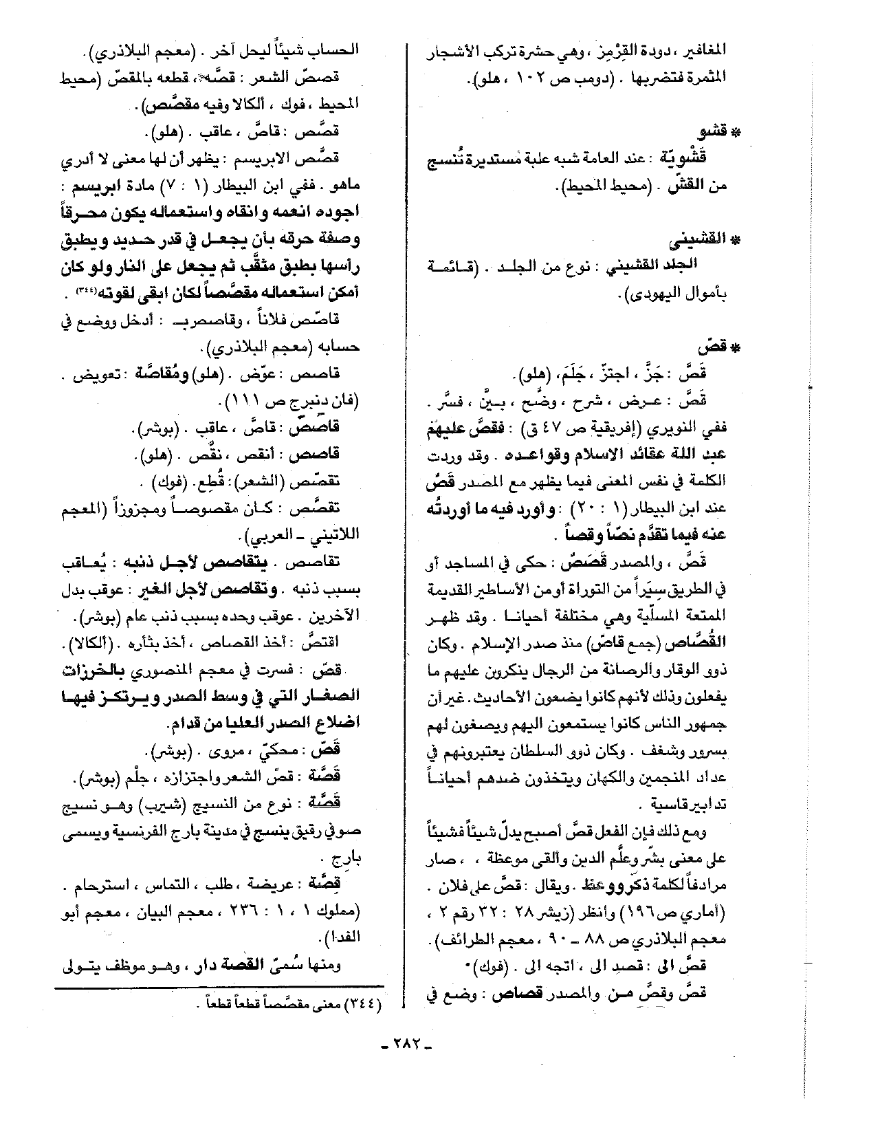 ومع ذلك فإن الفعل قص أصبح يدل شيئا فشيئا على معنى بشر وعلم الدين وألقى موعظة، صار مرادفا لكلمة ذكر ووعظ. ويقال: قص على فلان. (أماري ص196) وانظر (زيشر 28: 32 رقم 2، معجم البلاذري ص 00 - 90، معجم الطرائف).