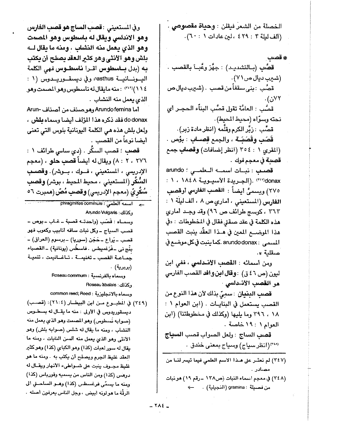 قصب: نبات اسمه العلمي arundo donax. ( الجريدة الآسيوية 1848، 1: 275) ويسمى أيضا: القصب الفارسي أو قصب الفارس (المستعيني، أماري ص8، ألف ليلة 1: 363، كوسج طرائف ص96) وقد وجد أماري هذه الكلمة في عقد صقلي فقال في المخطوطات: (في هذا الموضع المعين في هذا العقد ينبت القصب المسمى: arundo donax كما ينبت في كل موضع في صقلية.