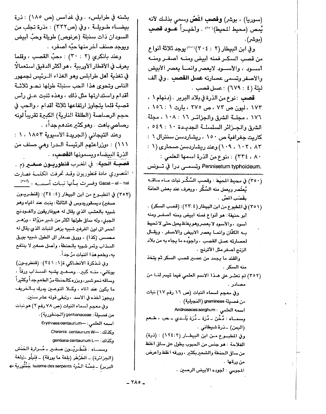 وفي ابن البيطار (2: 304) يوجد ثلاثة أنواع من قصب السكر فمنه أبيض ومنه أصفر ومنه أسود، والأسود لا يعصر وإنما يعصر الأبيض والأصفر وتسمى عصارته عسل القصب. وفي ألف ليلة (4: 679): عسل قصب قصب: نوع من الذرة في بلاد البربر. (دنهام 1، 173، ليون ص73، ص275، بارت 1: 156، 176، مجلة الشرق والجزائر 16: 108، مجلة الشرق والجزائر السلسلة الجديدة 10: 549، كاريت جغرافية ص150، ريشاردسن سنترال 1: 83، 102، 109) وعند ريشاردسن صحارى (1: 80، 334): (نوع من الذرة اسمها العلمي: Pennisetum typhoideum وتسمى درا في تونس بشنه في طرابلس). وفي غدامس (ص185): ذرة بيضاء طويلة، وفي (ص332): (ذرة تجلب من السودان ذات سنبلة (عرنوص) طويلة وحب ابيض ويوجد صنف آخر منها حبه أصفر).