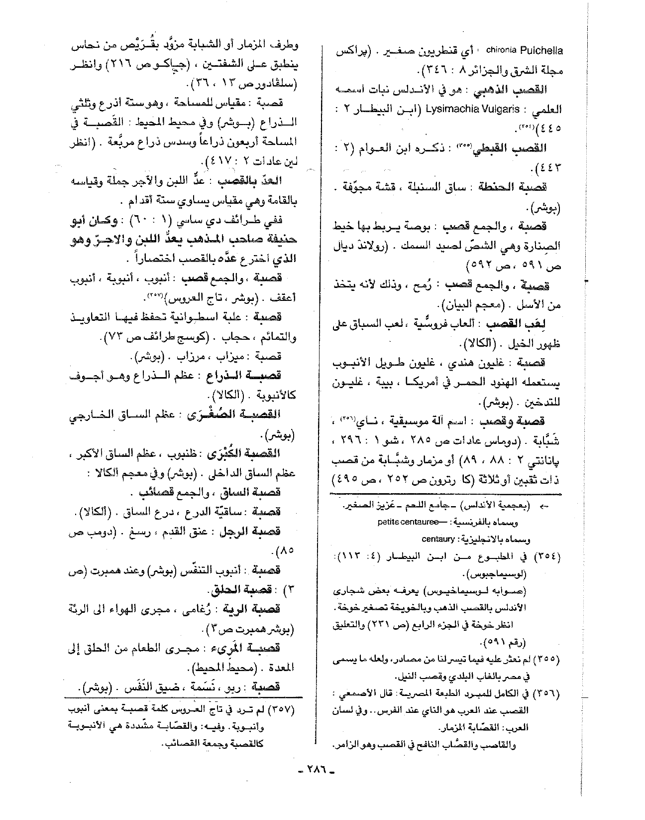 القصب الذعبي: هو في الأندلس نبات اسمه العلمي: Lysimachia Vulgaris ( ابن البيطار 2: 445).