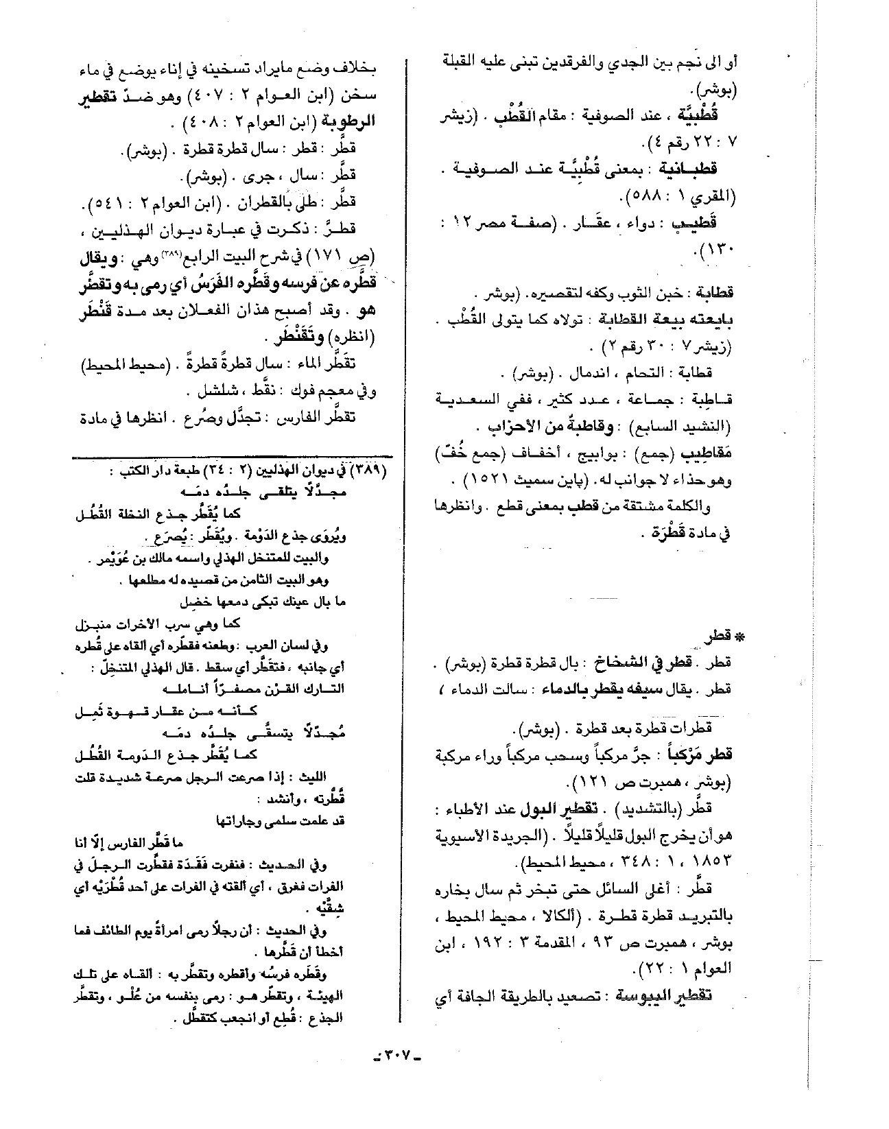 قطر: ذكرت في عبارة ديوان الهذليين، (ص171) في شرح البيت الرابع وهي: ويقال قطره عن فرسه وقطره الفرس أي رمى به وتقطر هو. وقد اصبح هذان الفعلان بعد مدة قنطر (انظره) وتقنطر.
