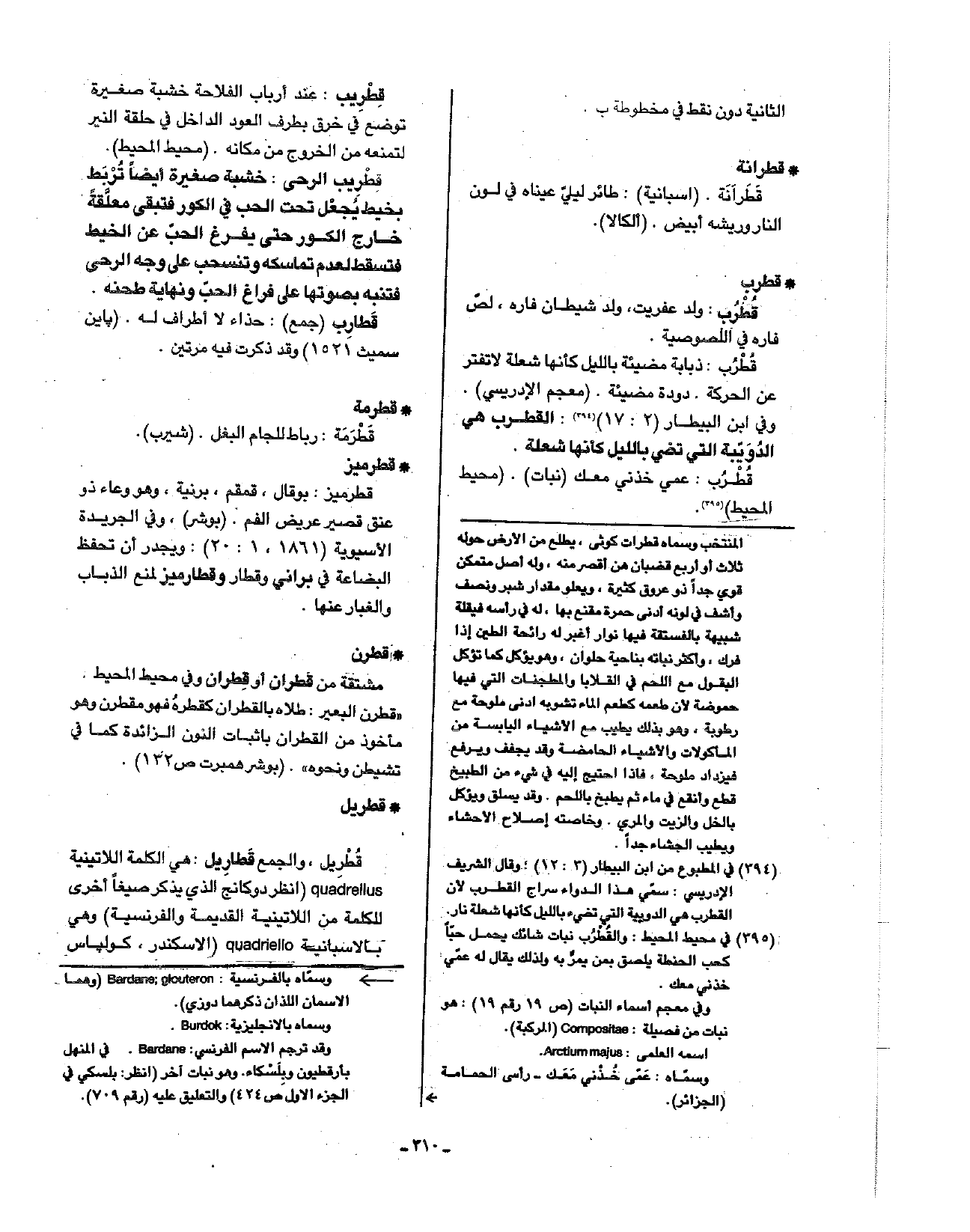 • قطريل: قطريل، والجمع قطاريل: هي الكلمة اللاتينية quadrellus ( انظر دوكانج الذي يذكر صيغا أخرى للكلمة من اللاتينية القديمة والفرنسية) وهي بالأسبانية quadriello ( الاسكندر، كولباس