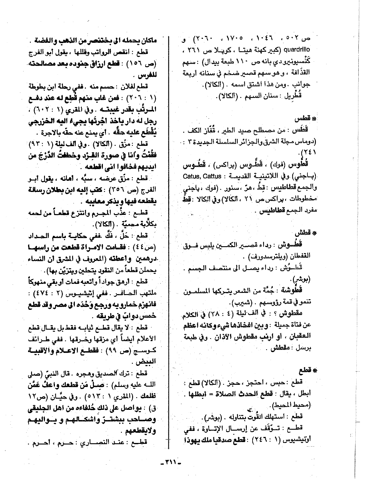 • قطس: قطس: من مصطلح صيد الطير، قفاز الكف. (دوماس مجلة الشرق والجزائر السلسلة الجديدة 3: 241).