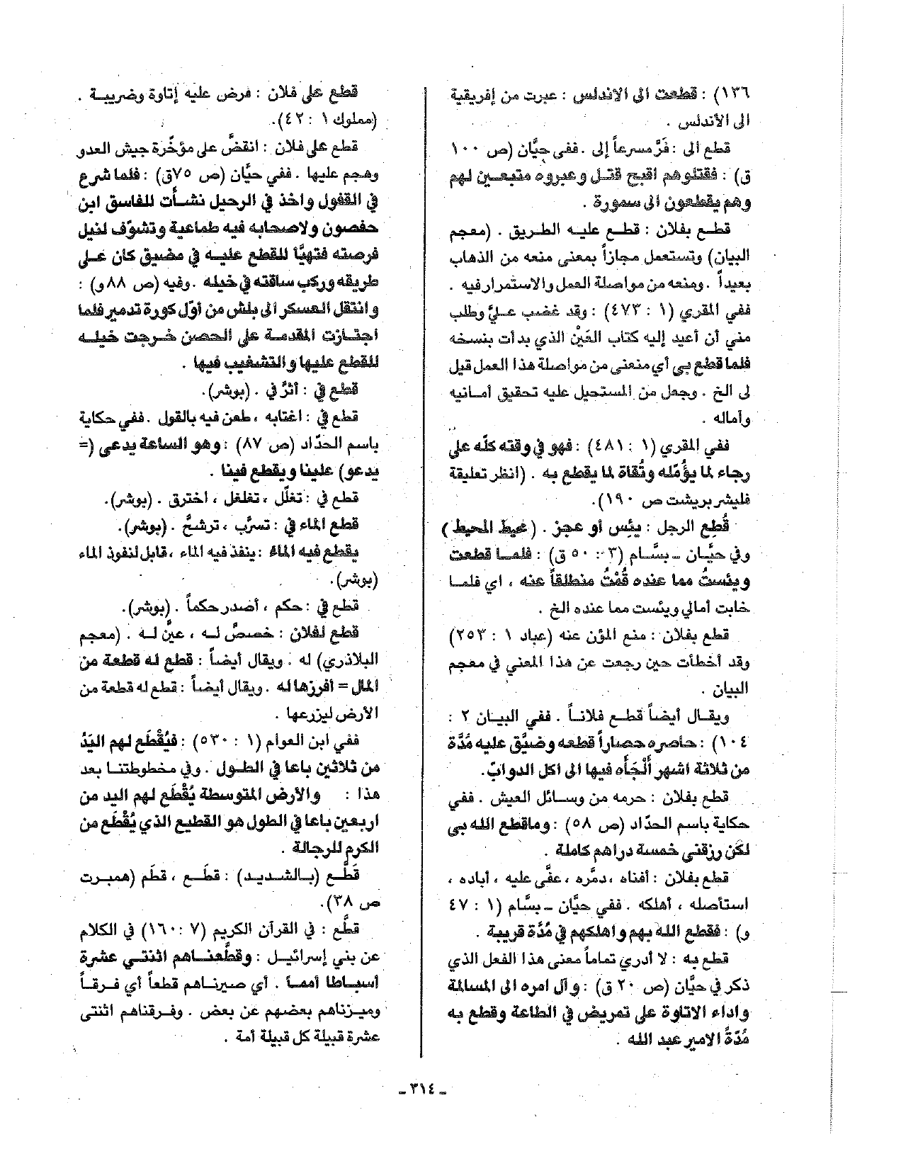 قطع على فلان: انقض على مؤخرة جيش العدو وهجم عليها. ففي حيان (ص75 ق): فلما شرع في القفول وأخذ في الرحيل نشأت للفاسق ابن حفصون ولأصحابه فيه طماعية وتشرف لنيل فرصته فتهيأ للقطع عليه في مضيق كان على طريقه وركب ساقته في خيله. وفيه (ص88 و): وانتقل العسكر إلى بلش من أول كورة تدمير فلما اجتازت المقدمة على الحصن خرجت خيله للقطع عليها والتشغيب فيها.