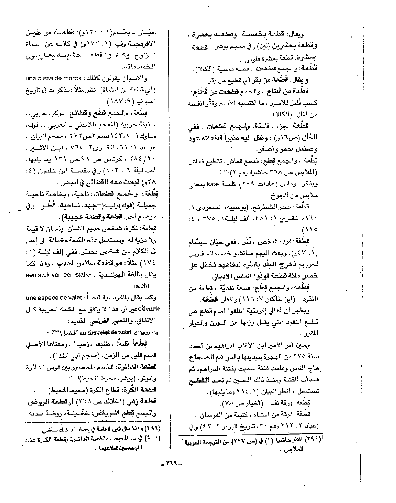 قطعة: نكرة شخص عديم الشأن، إنسان لا قيمة ولا مزية له. وتستعمل هذه الكلمة مضافة إلى أسم في الكلام عن شخص يحتقر. ففي ألف ليلة (1: 174) مثلا: هو قطعة سائس احدب. وهذا كما يقال باللغة الهولندية: een stuk van een stalk- necht وكما يقال بالفرنسية أيضا: une espece de valet de curie غير أن هذا لا يتفق مع الكلمة العربية كل الاتفاق. والتعبير الفرنسي القديم: un tiercelet de valet d'ecurie أفضل.