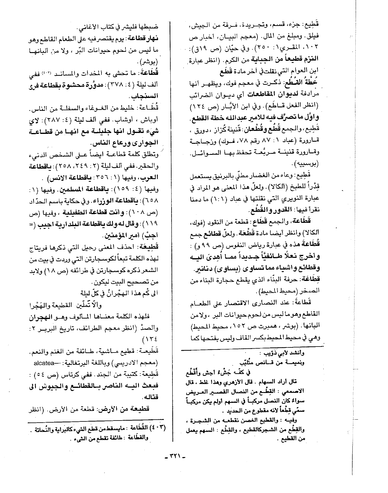 قطيعة: أحذف المعنى رحيل التي ذكرها فريتاج لهذه الكلمة تبعا لكوسجارتن التي وردت في بيت من الشعر ذكره كوسجارتن في طرائفه (ص18) ولابد من تصحيح البيت ليكون.