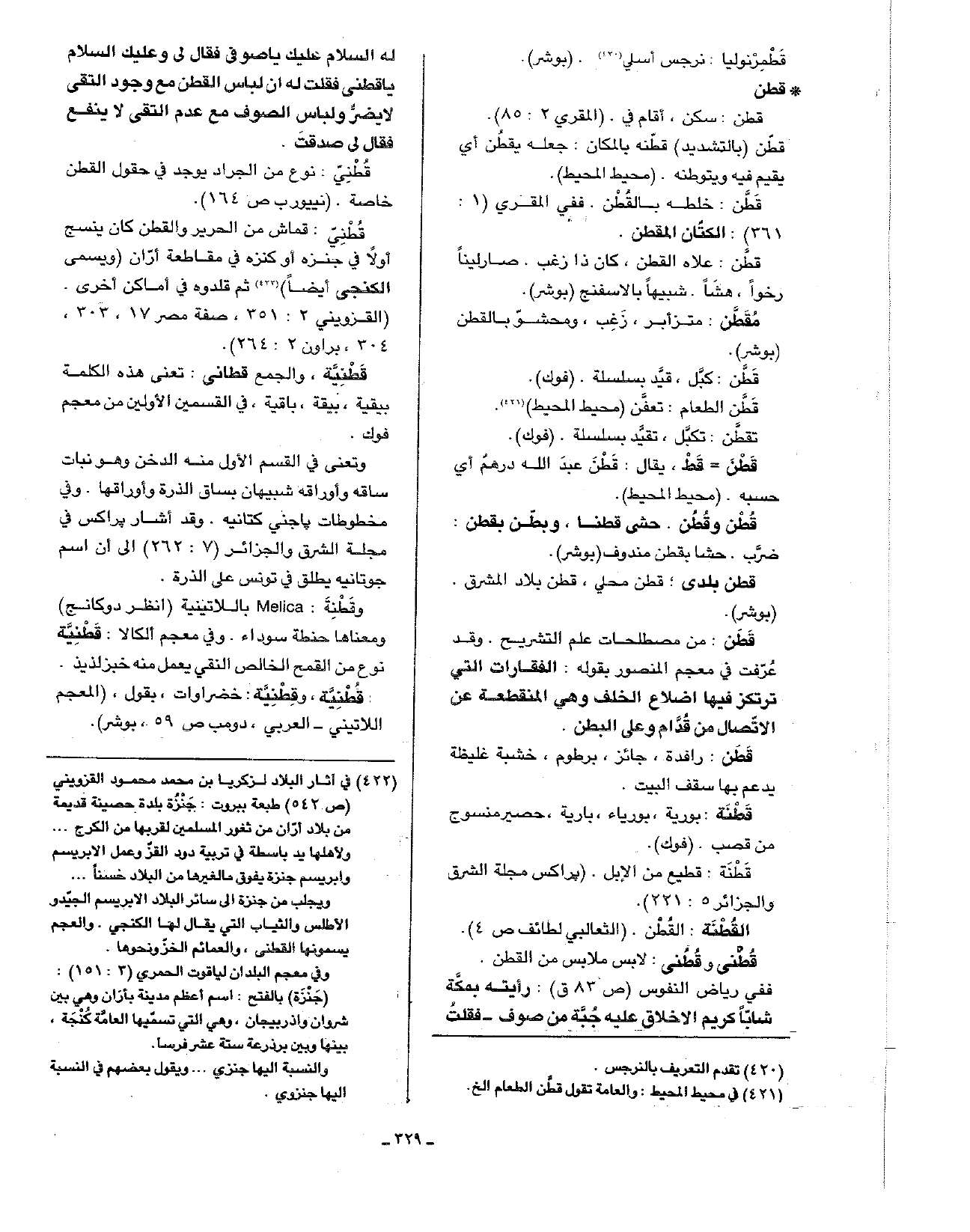 قطنى وقطنى: لابس ملابس من القطن. ففي رياض النفوس (ص83 ق): رأيته بمكة شابا كريم الأخلاق عليه جبة من صوف -فقلت له السلام عليك يا صوفي فقال لي وعليك السلام يا قطني فقلت له أن لباس القطن مع وجود التقى لا يضر ولباس الصوف مع عدم التقى لا ينفع فقال لي صدقت.
