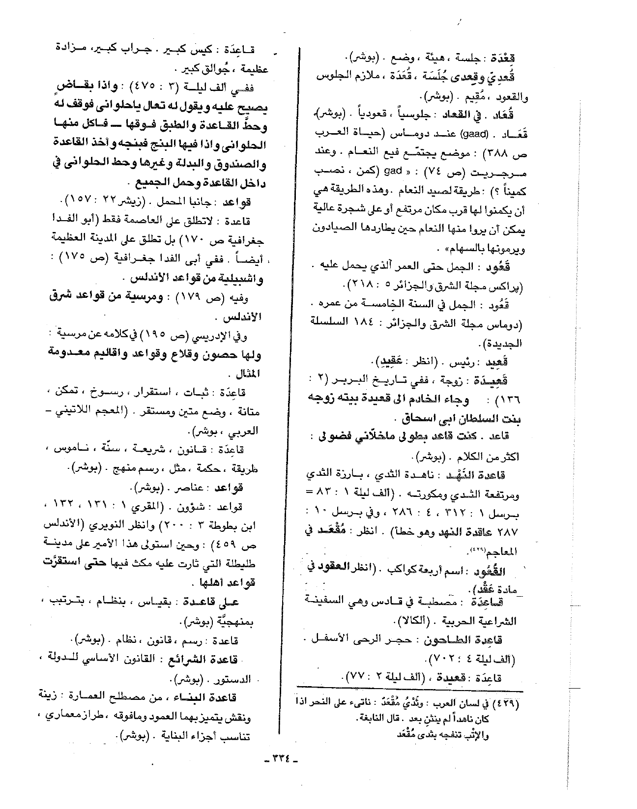 قواعد: شؤون. (المقري 1: 131، 132، ابن بطوطة 3: 200) وانظر النويري (الأندلس ص459): وحين استولى هذا الأمير على مدينة طليطلة التي ثارت عليه مكث فيها حتى استقرت قواعد أهلها.