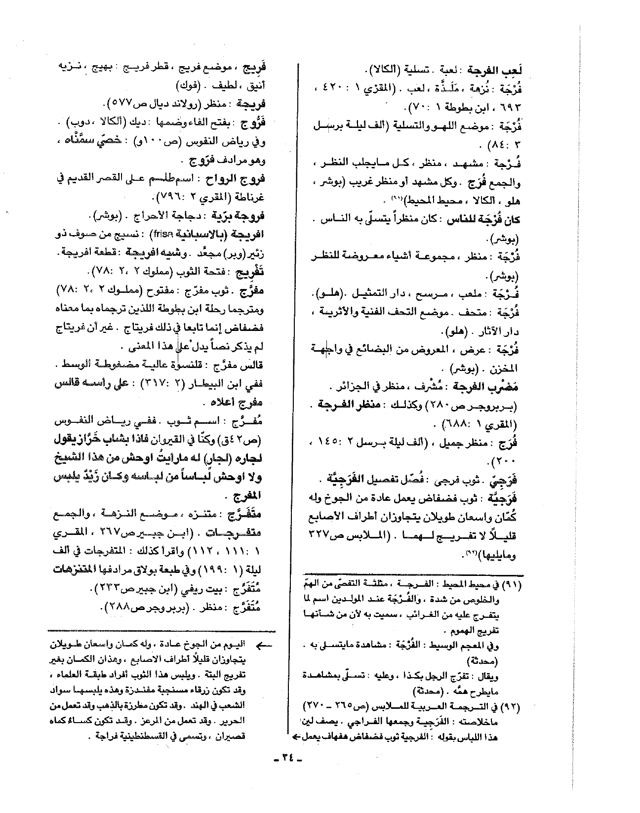 مفرج. ثوب مفرج: مفتوح (مملوك 2،78:2) ومترجما رحلة ابن بطوطة اللذين ترجماه بما معناه فضفاض إنما تابعا في ذلك فريتاج، غير أن فريتاج لم يذكر نصاً يدل على هذا المعنى.