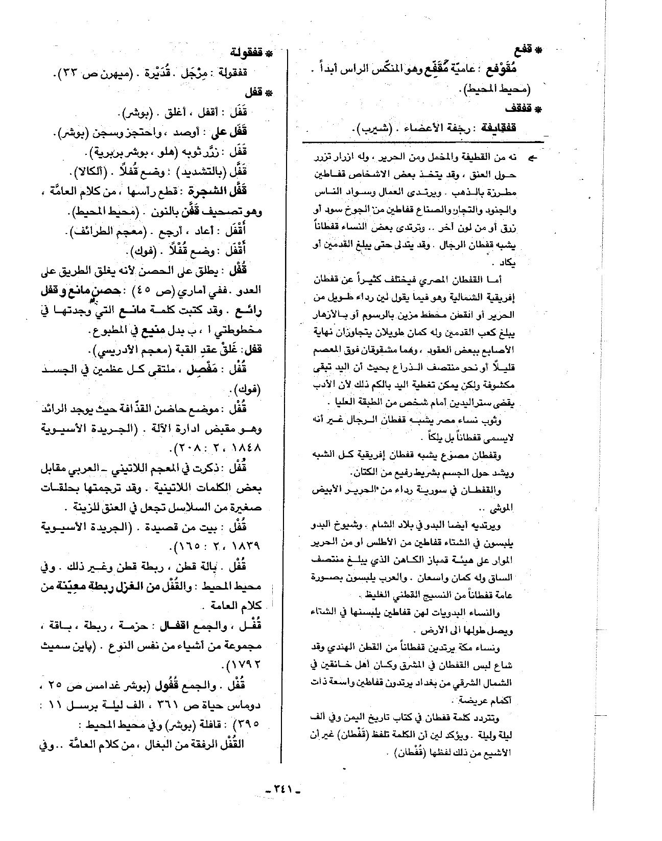 قفل: ذكرت في المعجم اللاتيني- العربي مقابل بعض الكلمات اللاتينية. وقد ترجمتها بحلقات صغيرة من السلاسل تجعل في العنق للزينة.