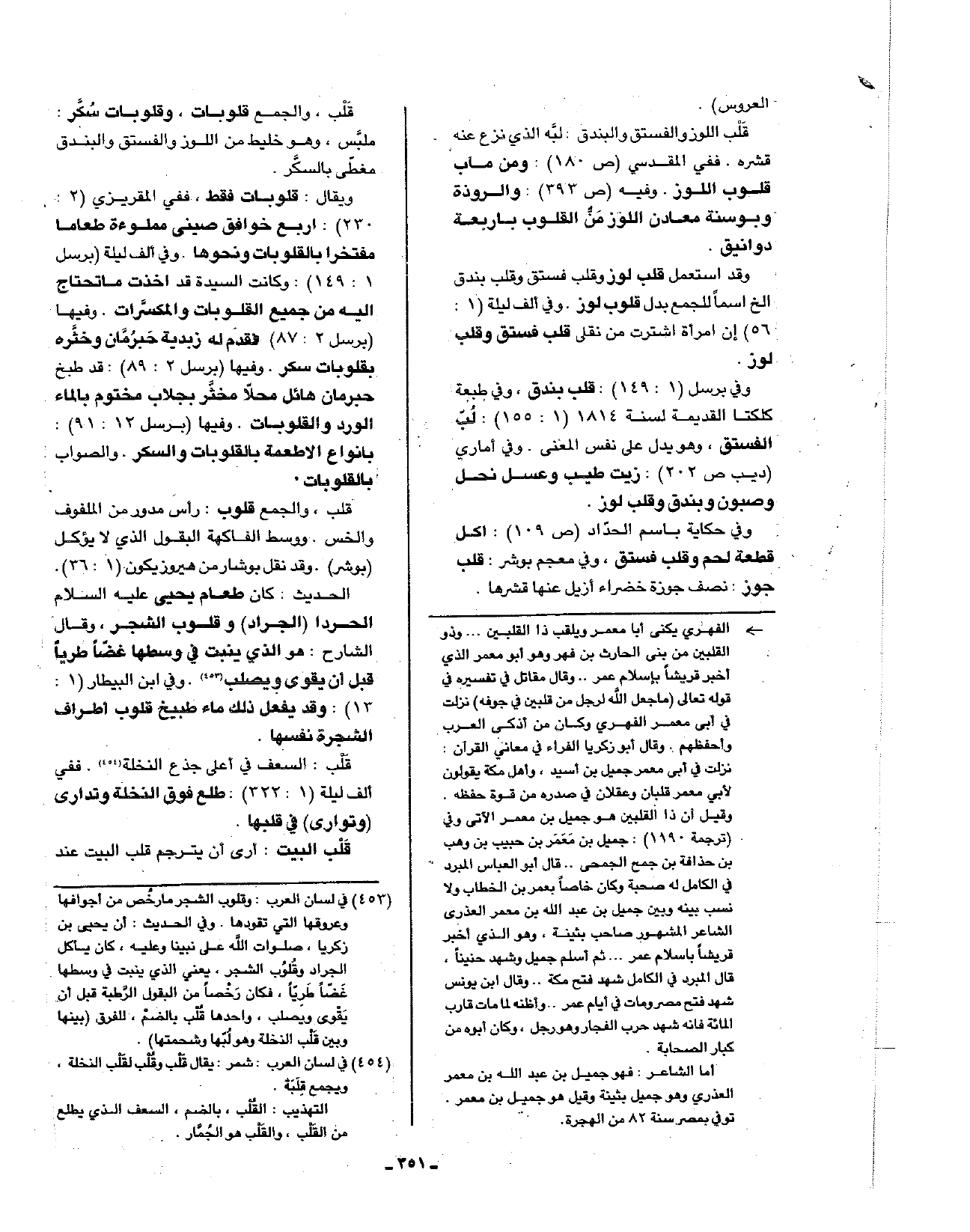 وقد أستعمل قلب لوز وقلب فستق وقلب بندق الخ اسما للجمع بدل قلوب لوز. وفي ألف ليلة (1: 56) إن امرأة اشترت من نقلى قلب فستق وقلب لوز.