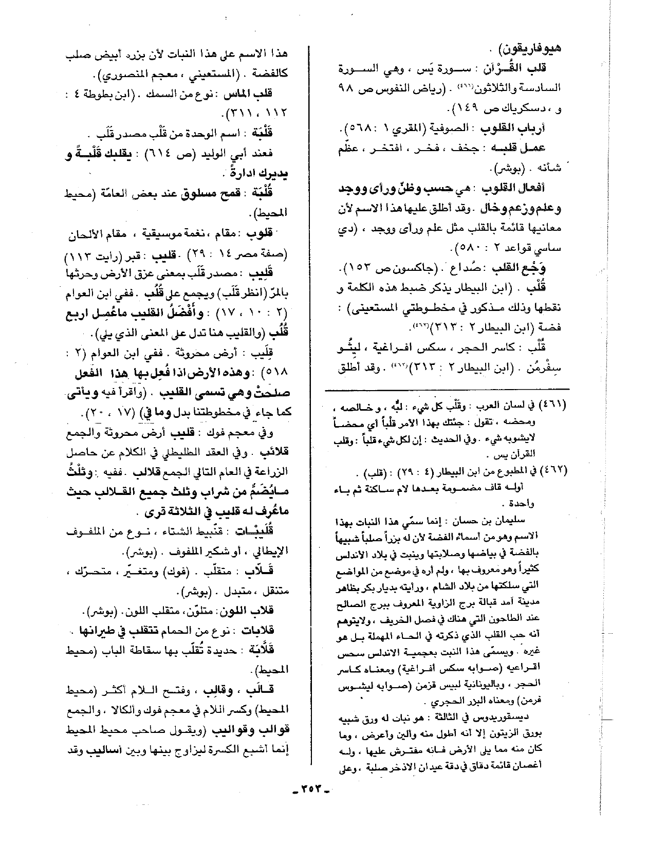 وجع القلب: صداع. (جاكسون ص153). قلب. (ابن البيطار يذكر ضبط هذه الكلمة ونقطها وذلك مذكور في مخطوطتي المستعيني): فضة (ابن البيطار 2: 313).