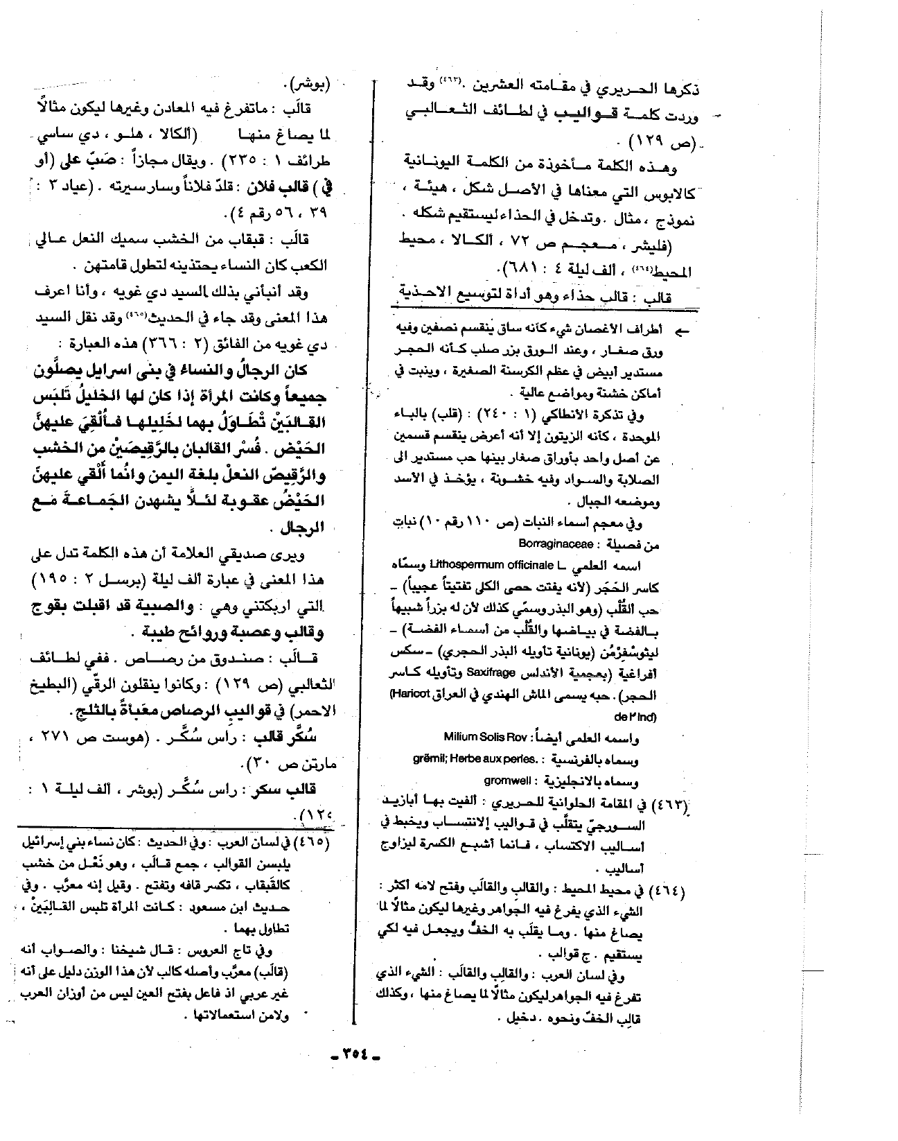 وقد أنبأني بذلك السيد دي غويه، وأنا أعرف هذا المعنى وقد جاء في الحديث وقد نقل السيد دي غويه من الفائق (2: 366) هذه العبارة: كان الرجال والنساء في بني إسرائيل يصلون القالبين تطاول بهما لخليلها فألقي عليهن الحيض. فسر القالبان بالرقيصين من الخشب والرقيص النعل بلغة اليمن وإنما القي عليهن الحيض عقوبة لئلا يشهدن الجماعة مع الرجال.