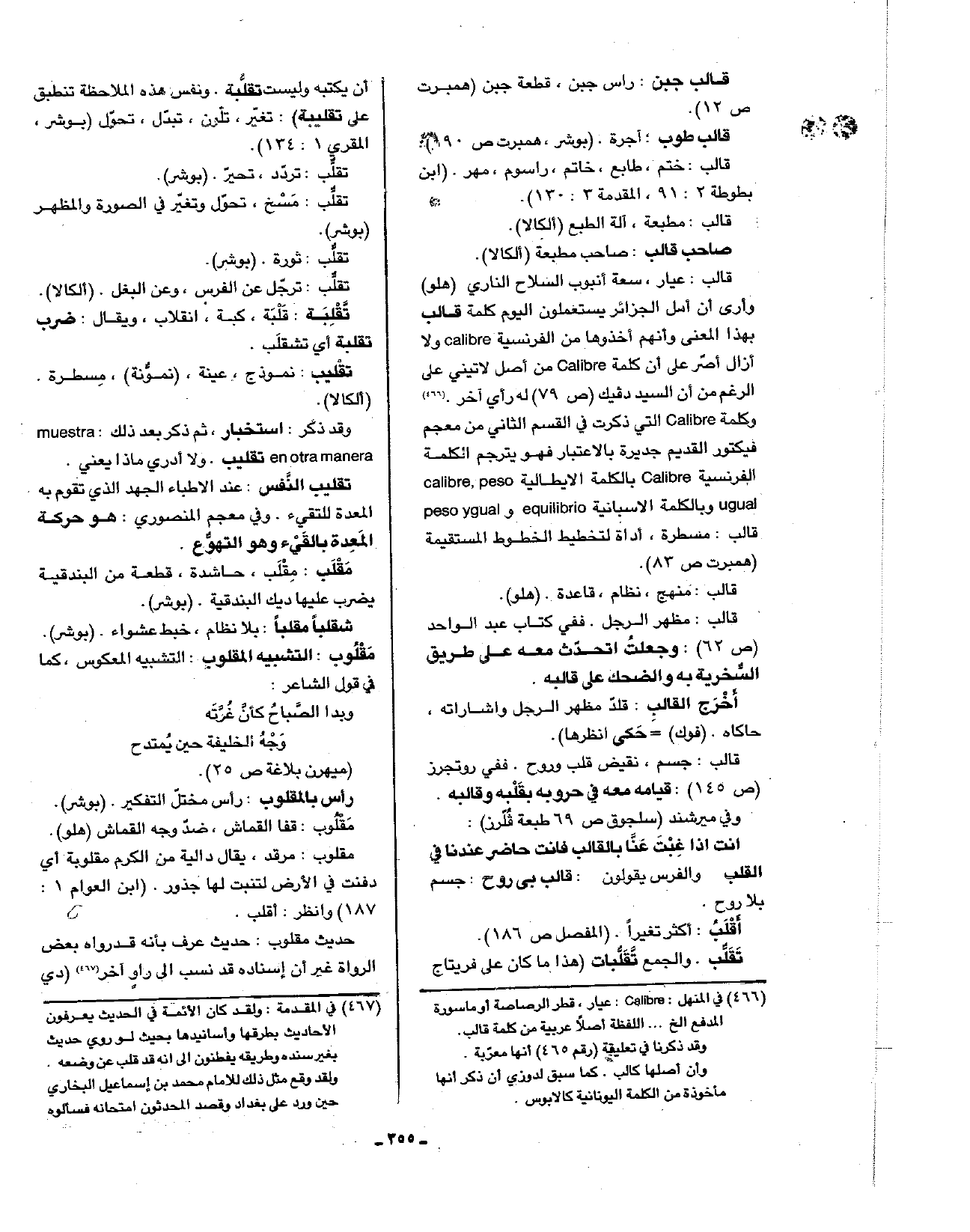 قالب: عيار، سعة أنبوب السلاح الناري (هلو) وأرى أن أهل الجزائر يستعملون اليوم كلمة قالب بهذا المعنى وأنهم أخذوها من الفرنسية Calibre ولا أزال أصر على أن كلمة Calibre من أصل لاتيني على الرغم من أن السيد دفيك (ص79) له رأي آخر. وكلمة Calibre التي ذكرت في القسم الثاني من معجم فيكتور القديم جديرة بالاعتبار فهو يترجم الكلمة الفرنسية Calibre بالكلمة الإيطالية calibre, peso ugual وبالكلمة الأسبانية equilibrio و peso ygual قالب: مشطرة، اداة لتخطيط الخطوط المستقيمة (همبرت ص83).