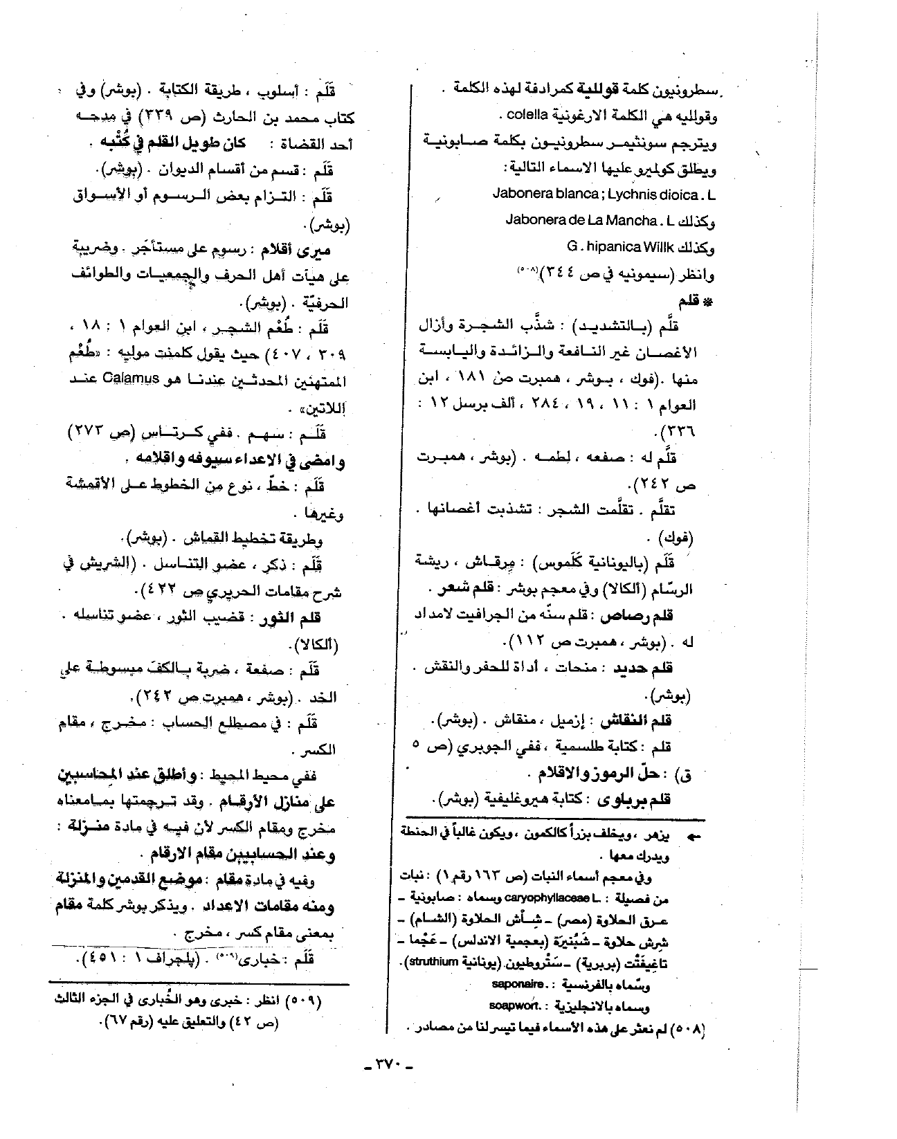 قلم: طعم الشجر، ابن العوام 1: 18، 309، 407) حيث يقول كلمنت موليه: (طعم الممتهنين المحدثين عندنا هو Calamus عند اللاتين).