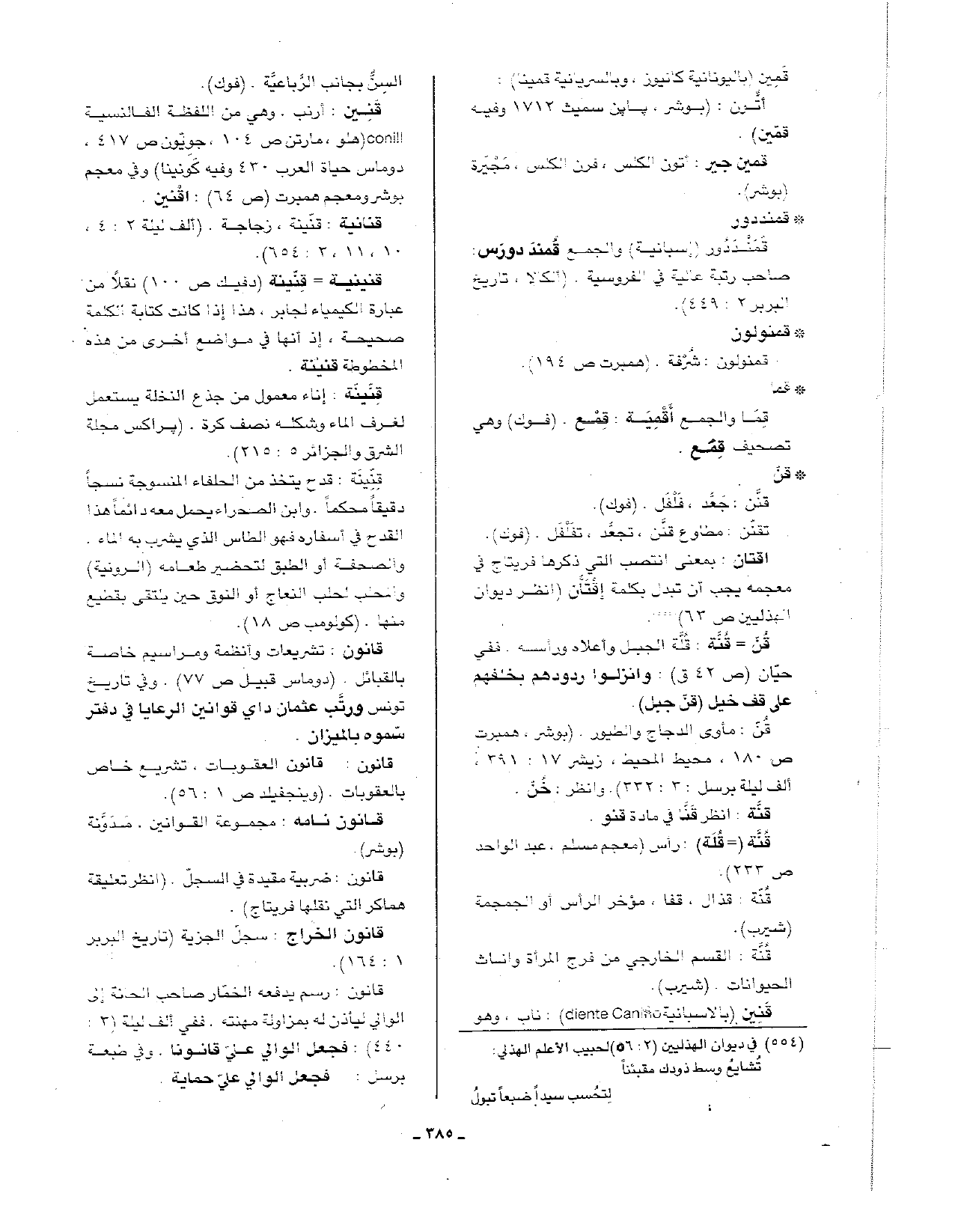 قنين: أرنب. وهي من اللفظة الفالنسية conill ( هلو، مارتن ص104، حونيون ص417، دوماس حياة العرب 430 وفيه كونينا) وفي معجم بوشر ومعجم همبرت (ص64): اقنين.