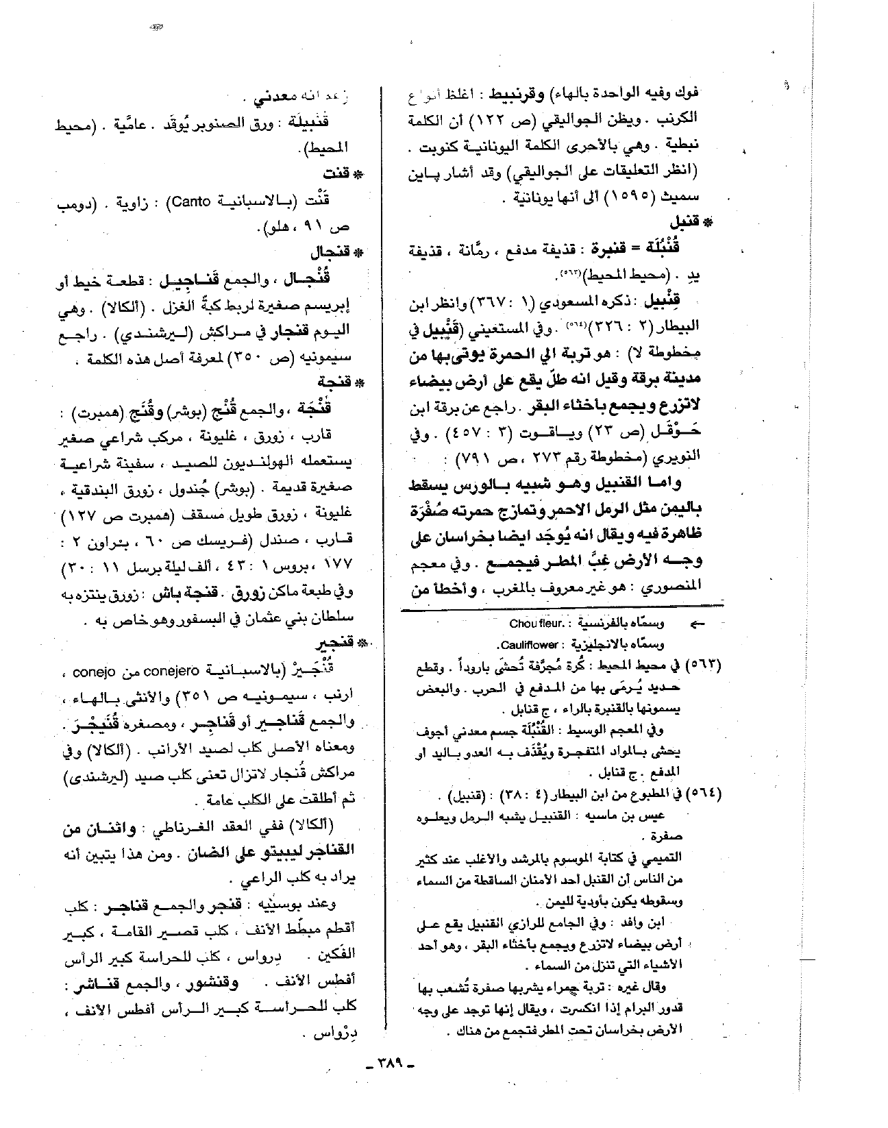 فوك وفيه الواحدة بالهاء) وقرنبيط: أغلظ أنواع الكرنب. ويظن الجواليقي (ص122) أن الكلمة نبطية. وهي بالأحرى الكلمة اليونانية كنويت. (انظر التعليقات على الجواليقي) وقد أشار باين سميث (1595) إلى أنها يونانية.