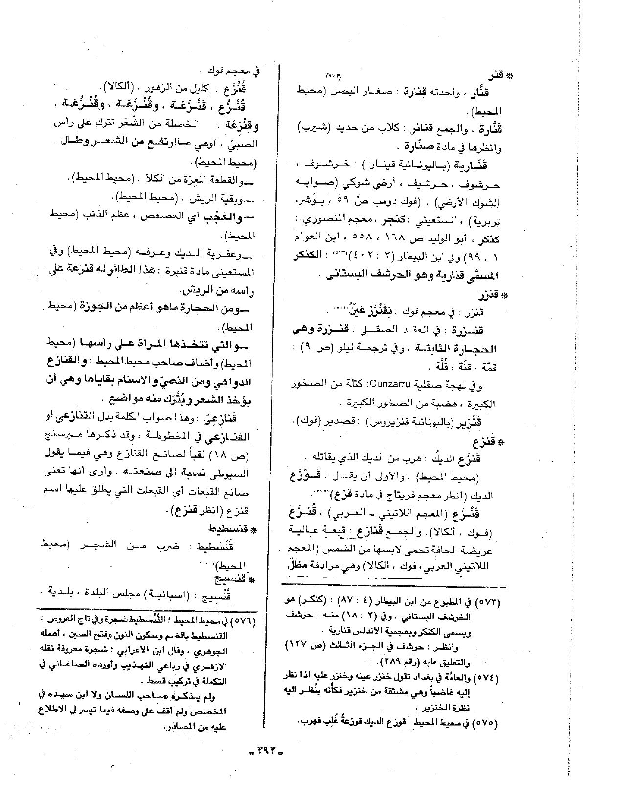 قنارية (باليونانية قينارا): خرشوف، حرشوف، حرشيف، أرضي شوكي (صوابه الشوك الأرضي). (فوك دومب ص59، بوشر، بربرية)، المستعيني: كنجر، معجم المنصوري: كنك، أبو الوليد ص168، 558، ابن العوام 1، 99) وفي ابن البيطار (2: 402): الكنكر المسمى قنارية وهو الحرشف البستاني.