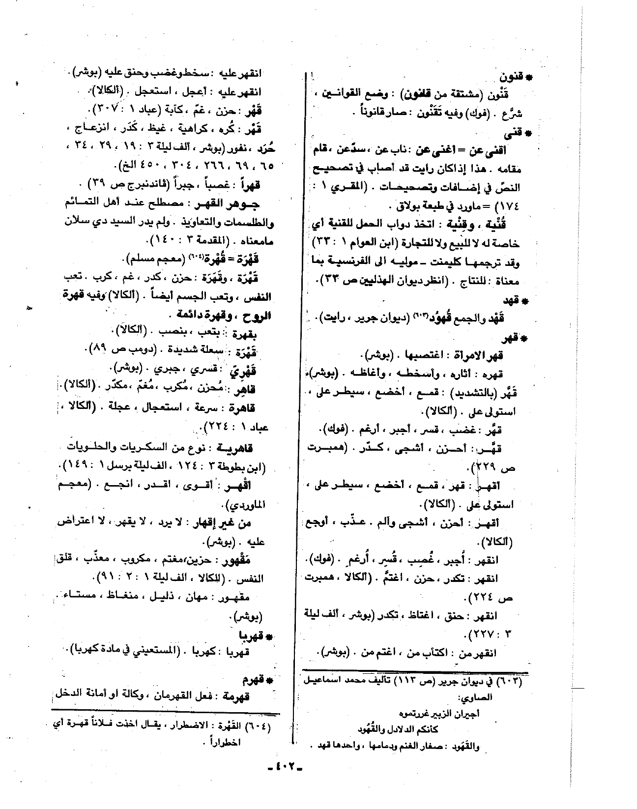• قنى: اقنى عن= أغنى عن: ناب عن، سد عن، قام مقامه. هذا إذا كان رايت قد أصاب في تصحيح النص في إضافات وتصحيحات. (المقري 1: 174) = ما ورد في طبعة بولاق.