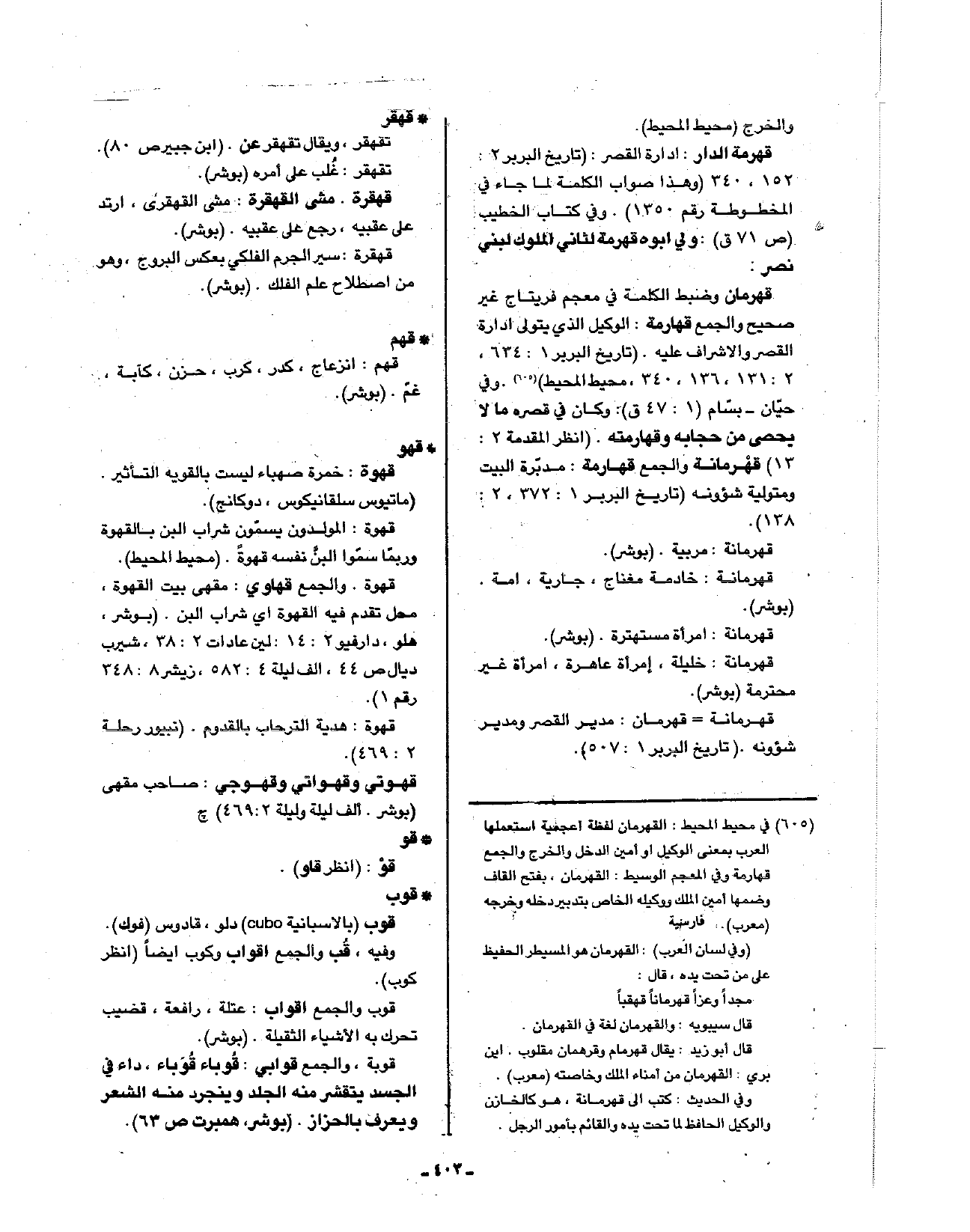 قهرمان وضبط الكلمة في معجم فريتاج غير صحيح والجمع قهارمة: الوكيل الذي يتولى إدارة القصر والإشراف عليه. (تاريخ البربر 1: 634، 2: 131، 136، 340، محيط المحيط) وفي حيان- بسام (1: 47 ق): وكان في قصره ما لا يحصى من حجابه وقهارمته. (انظر المقدمة 2: 13) قهرمانة والجمع قهارمة: مدبرة البيت ومتولية شؤونه (تاريخ البربر 1: 372، 2: 138).