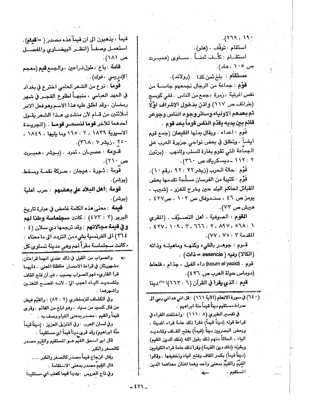 قيم: الذي يقرأ في القرآن (6: 162) دينا قيما، يذهبون إلى أن قيما مصدر (=قيام). استعمل وصفا (انظر البيضاوي والمفصل ص181).