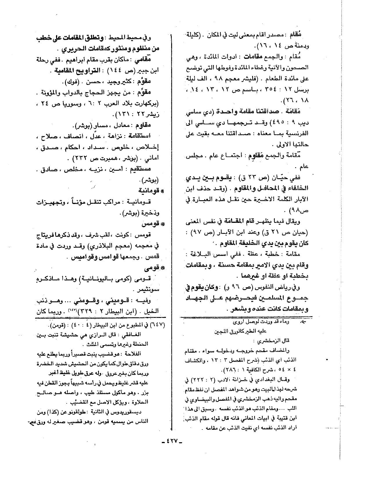 ويقال فيما يظهر قام المقامة في نفس المعنى (حيان ص21 ق) وعند ابن الآبار (ص97): كان يقوم بين يدي الخليفة المقاوم.