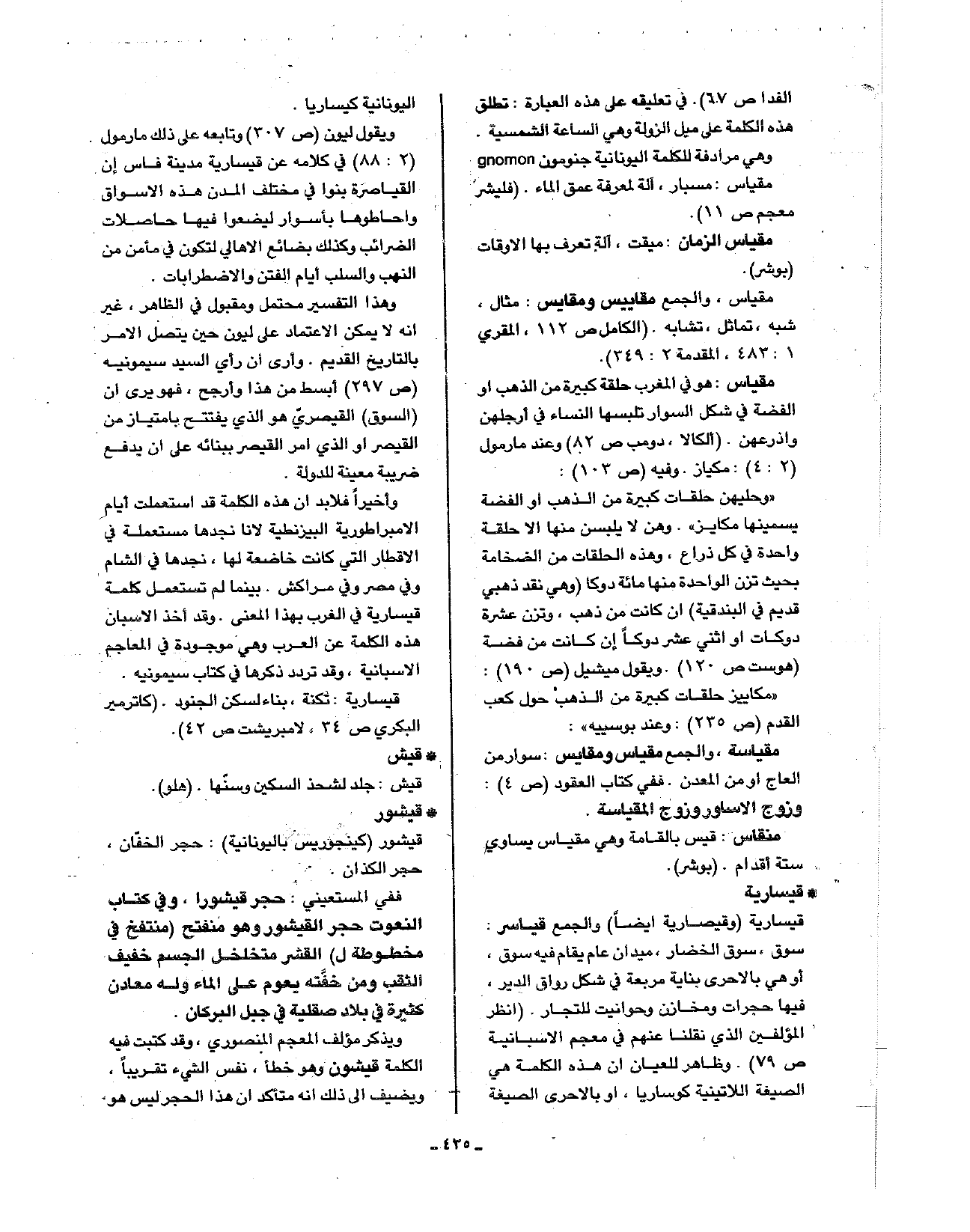 • قيسارية: قيسارية (وقيصارية أيضا) والجمع قيلسر: سوق، سوق الخضار، ميدان عام يقام فيه سوق، أو هي بالأحرى بناية مربعة في شكل رواق الدير، فيها حجرات ومخازن وحوانيت للتجار. (انظر المؤلفين الذي نقلنا عنهم في معجم الأسبانية ص79). وظاهر للعيان أن هذه الكلمة هي الصيغة اللاتينية كوساريا، أو بالأحرى الصيغة اليونانية كيساريا.