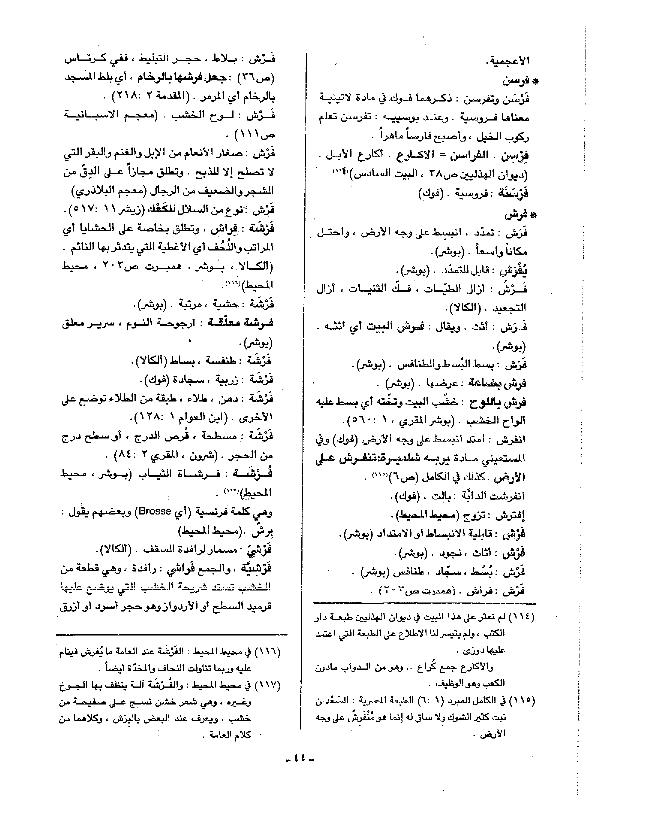 فرش: صغار الأنعام من الإبل والغنم والبقر التي لا تصلح إلا للذبح. وتطلق مجازا على الدق من الشجر والضعيف من الرجال (معجم البلاذري).