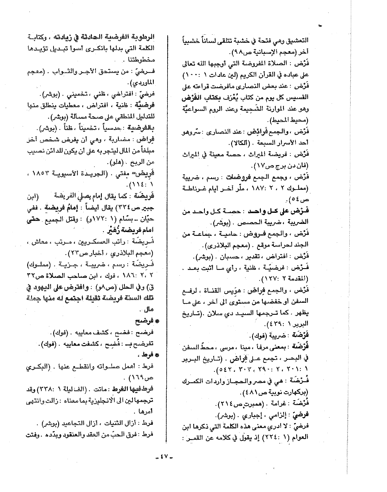 فرضي: لا ادري معنى هذه الكلمة التي ذكرها ابن العوام (1: 224) إذ يقول في كلامه عن القمر: الرطوبة الفرضية الحادثة في زيارته، وكتابة الكلمة التي بدلها بانكري أسوأ تبديل تؤيدها مخطوطتنا.