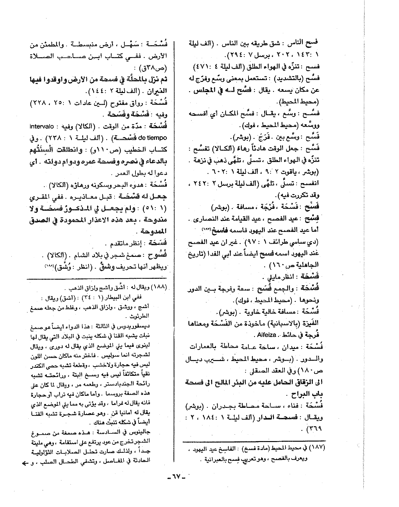 فسحة: سهل، أرض منبسطة. والمطمئن من الأرض. ففي كتاب ابن صاحب الصلاة (ص38 ق): ثم نزل بالمحلة في فسحة من الأرض وأوقدوا فيها النيران. (ألف ليلة144:2).