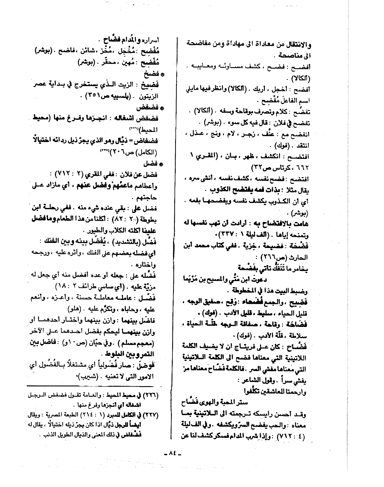 فضاح: كان فريتاج أن لا يضيف الكلمة اللاتينية التي معناها فضح إلى الكلمة اللاتينية التي معناها مفشي السر. فالكلمة فضاح معناها من يفشي سرا. وقول الشاعر: