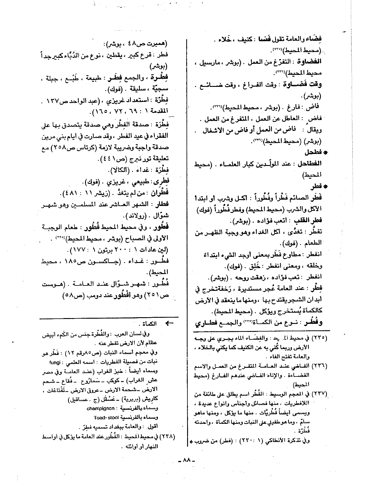وفطر: نوع من الكمأة والجمع فطاري (همبرت ص48، بوشر): فطر: قرع كبير، يقطين، نوع من الدباء كبير جدا (بوشر).