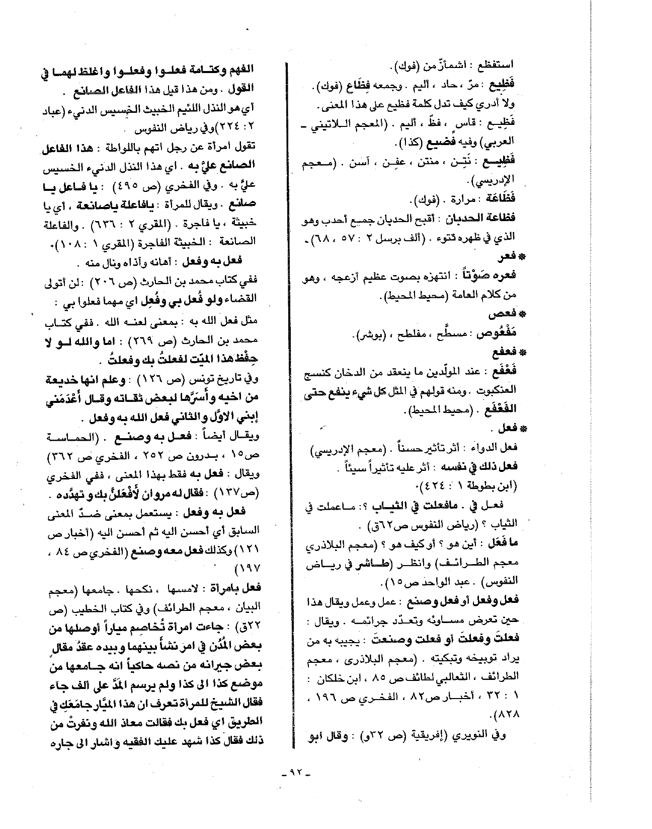 فعل وفعل أو فعل وصنع: عمل وعمل ويقال هذا حين تعرض مساوئه وتعدد جرائمه. ويقال: فعلت وفعلت أو فعلت وصنعت: يجيبه به من يراد توبيخه وتبكيته. (معجم البلاذري، معجم الطرائف، الثعالبي لطائف ص85، ابن خلكان: 1: 32، أخبار ص82، الفخري ص196، 828).
