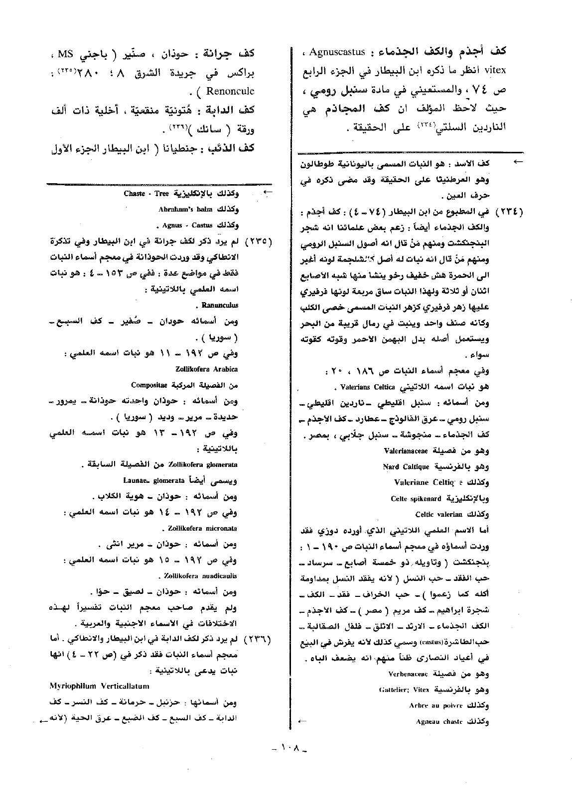 كف أجذم والكف الجذماء: Agnuscastus، vitex انظر ما ذكره ابن البيطار في الجزء الرابع ص74، والمستعيني في مادة سنبل رومي، حيث لحظ المؤلف إن كف المجاذم هي الناردين السلتي على الحقيقة.