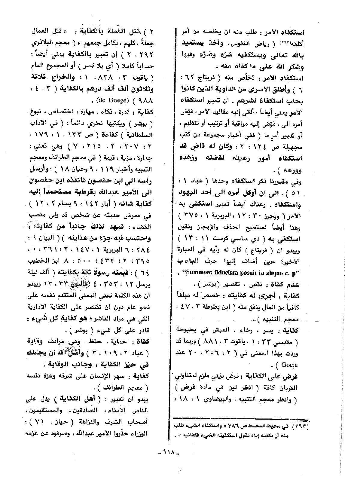 فرض على الكفاية: فرض ديني ملزم لمتناولي القربان كافة (انظر لين في مادة فرض) (وانظر معجم التنبيه، والبيضاوي 1، 18، 2). قتل الفعلة بالكفاية: (قتل العمال جملةً، بكاملهم جمعهم) (معجم البلاذري 292، 2) إن تعبير بالكفاية يعني أيضاً: حساباً كاملا (أي بلا كسر) أو المجموع العام (ياقوت 3 1: 838: والخراج ثلاثة وثلاثون ألف ألف درهم بالكفاية (988:4:3) ( de Goege) .
