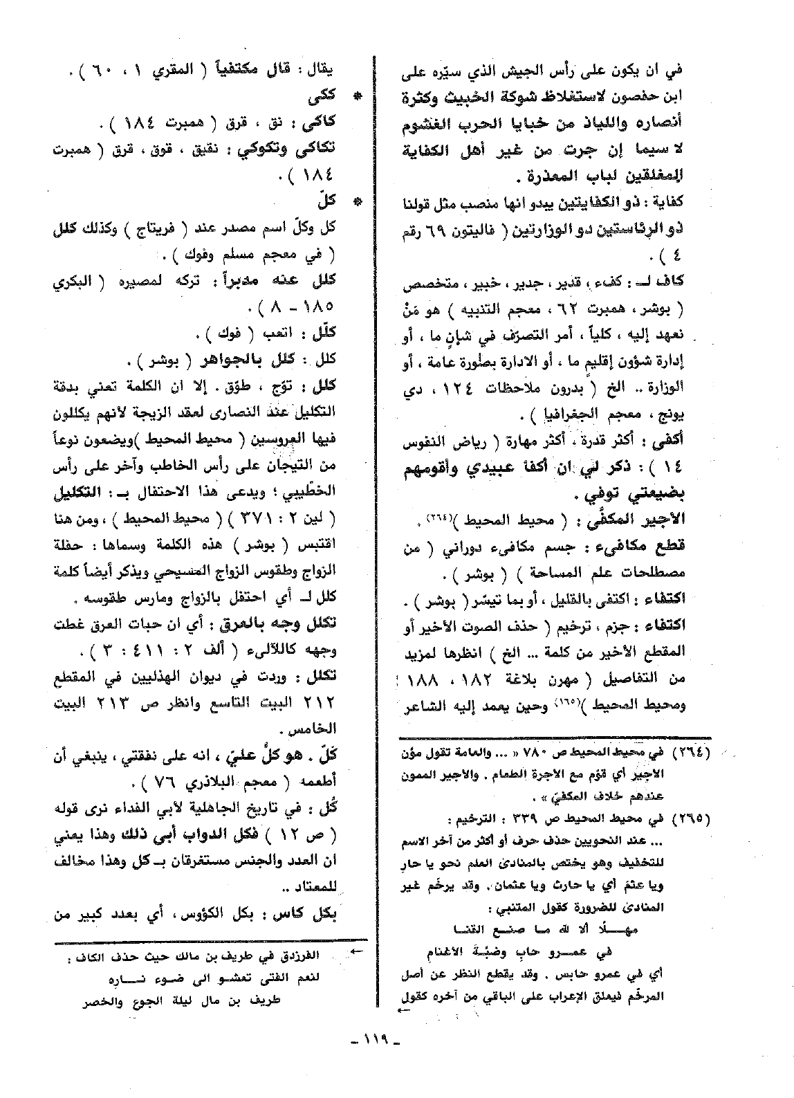 • كلّ: كل وكلّ اسم مصدر عند (فريتاج) وكذلك كلل (في معجم مسلم فوك).