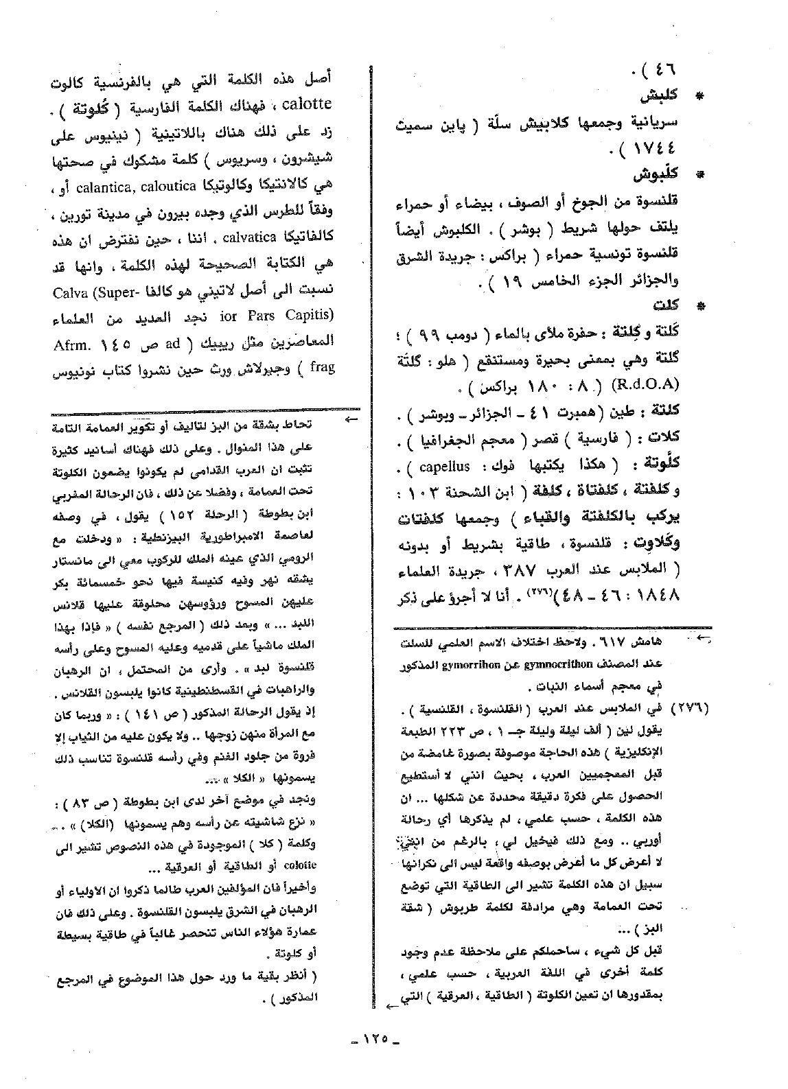 وكلفتة، وكلفتاة، كلفة (ابن الشحنة 103: يركب بالكلفتة والقباء) وجمعها كلفتات وكَلاوِت: قلنسوة، طاقية بشريط أو بدونه (الملابس عند العرب 387، جريدة العلماء 46:1848 - 48). أنا لا أجرؤ على ذكر أصل هذه الكلمة هي بالفرنسية كالوت calotte، فهناك الكلمة الفارسية (كُلوتة). زد على ذلك هناك باللاتينية (نينيوس على شيشرون، وسريوس) كلمة مشكوك في صحتها هي كالانتيكا وكالوتيكا calantica, caloutica أو، وفقاً للطرس الذي وجده في مدينة تورين، كتالفاتيكا calvatica. إننا، حين نفترض إن هذه الكتابة الصحيحة لهذه الكلمة، وإنها قد نسبت إلى أصل لاتيني هو كالفا Caiva (superior Pars Capitis) نجد العديد من العلماء المعاصرين مثل ريبيك ( ad ص145 Afrm frag) وجيرلاش ورث حين نشروا كتاب نونيوس