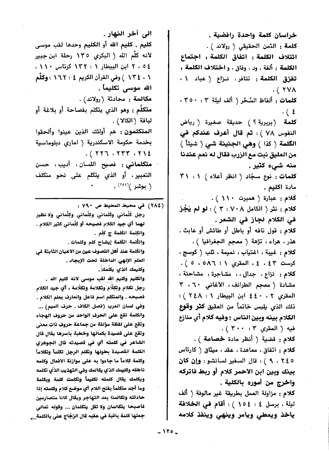 كلام: نزاع، جدال، مشاجرة، مشاحنة، مشادة (معجم الطرائف، الأغاني 60، 3 المقري 2، 440 ابن البيطار 248:1): ذلك الذي يلبس خاتماً من العقيق كثر وقوع الكلام بينه وبين الناس؛ وفيه كلام أي منازع فيه (المقري 300:3).