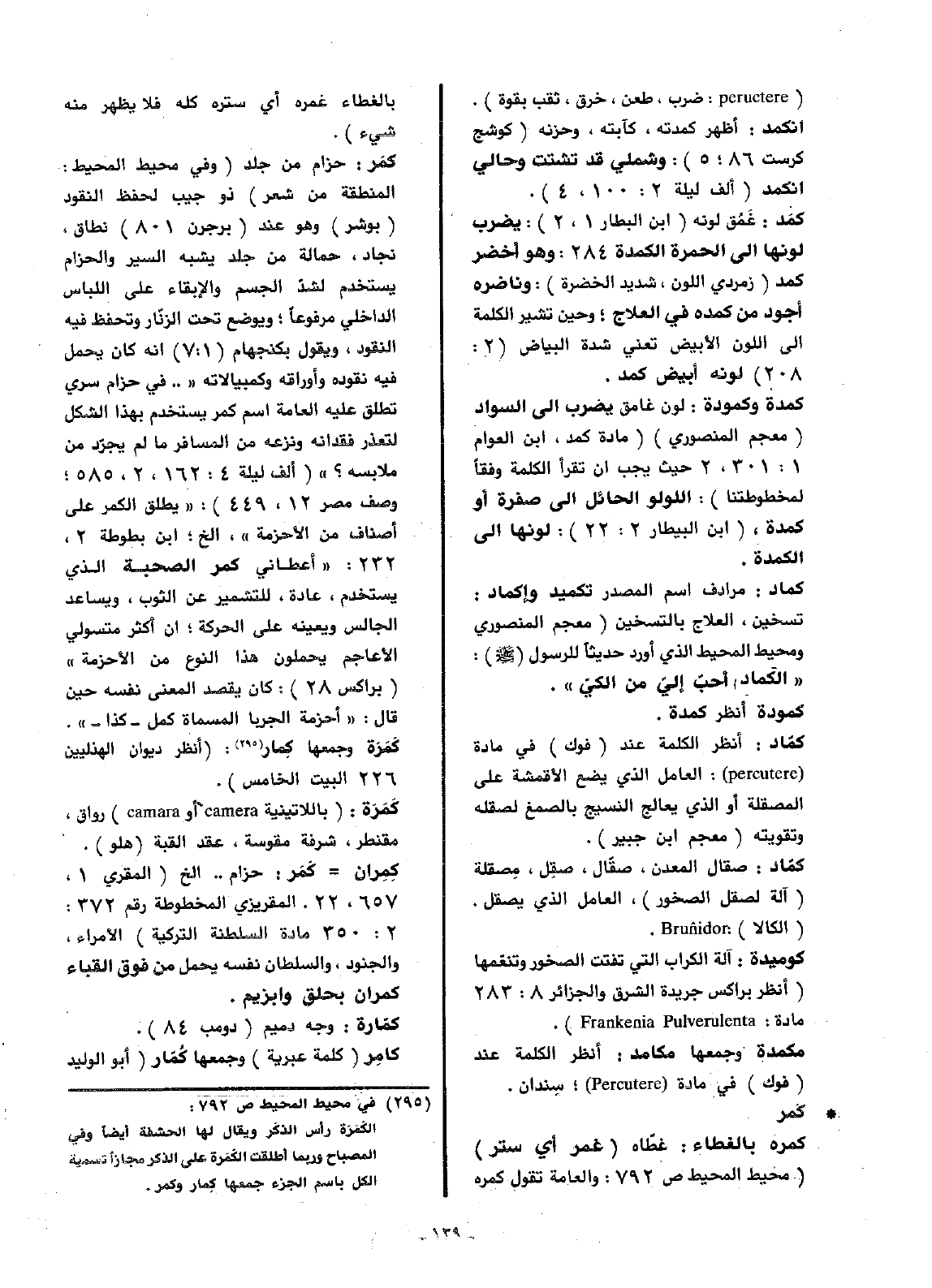 كمَر: حزام من جلد (وفي محيط المحيط: المنطقة من شعر) ذو جيب لحفظ النقود (بوشر) وهو عند (برجرن 801) نطاق، نجاد، حمالة من جلد يشبه السير والحزام يستخدم لشّد الجسم والإبقاء على اللباس الداخلي مرفوعاً؛ ويوضع تحت الزنّار وتحفظ فيه النقود، ويقول بكنجهام (7:1) إنه كان يحمل فيه نقوده وأوراقه وكمبيالاته ( .. في حزام سري تطلق عليه العامة اسم كمر يستخدم بهذا الشكل لتعذر فقدانه ونزعه من المسافر ما لم يجرّد من ملابسه؟) (ألف ليلة 162:4، 2، 585؛ وصف مصر 12، 449): (يطلق الكمر على أصناف من الأحزمة)، الخ؛ ابن بطوطة 2، 232: (أعطاني كمر الصحبة الذي يستخدم، عادة للتشمير عن الثوب، ويساعد الجالس ويعنيه على الحركة؛ إن أكثر متسولي الأعاجم يحملون هذا النوع من الأحزمة) (براكس 28): كان يقصد المعنى نفسه حين قال: (أحزمة الجربا المسماة كمل -كذا-).