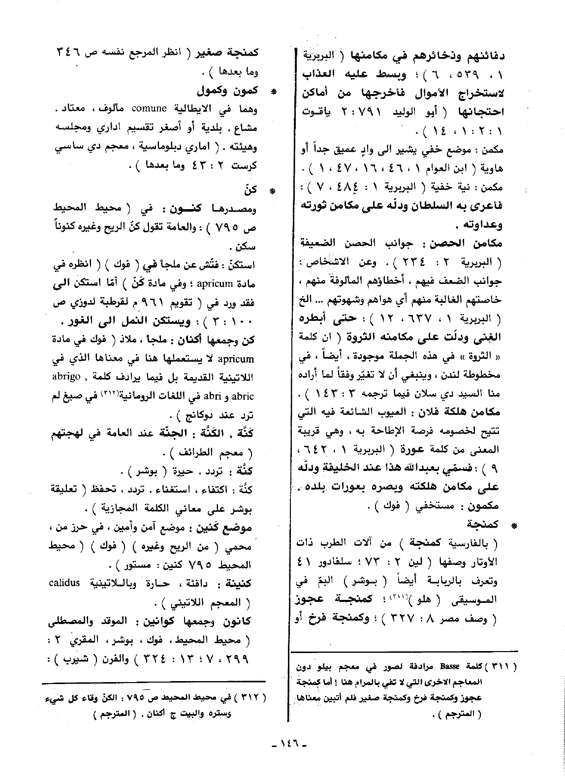 • كمون وكمول: وهما في الإيطالية comune مألوف، معتاد. مشاع. بلدية أو أصغر تقسيم إداري ومجلسه وهيئته. (أماري دبلوماسية، معجم دي ساسي كرست 43:2 وما بعدها).