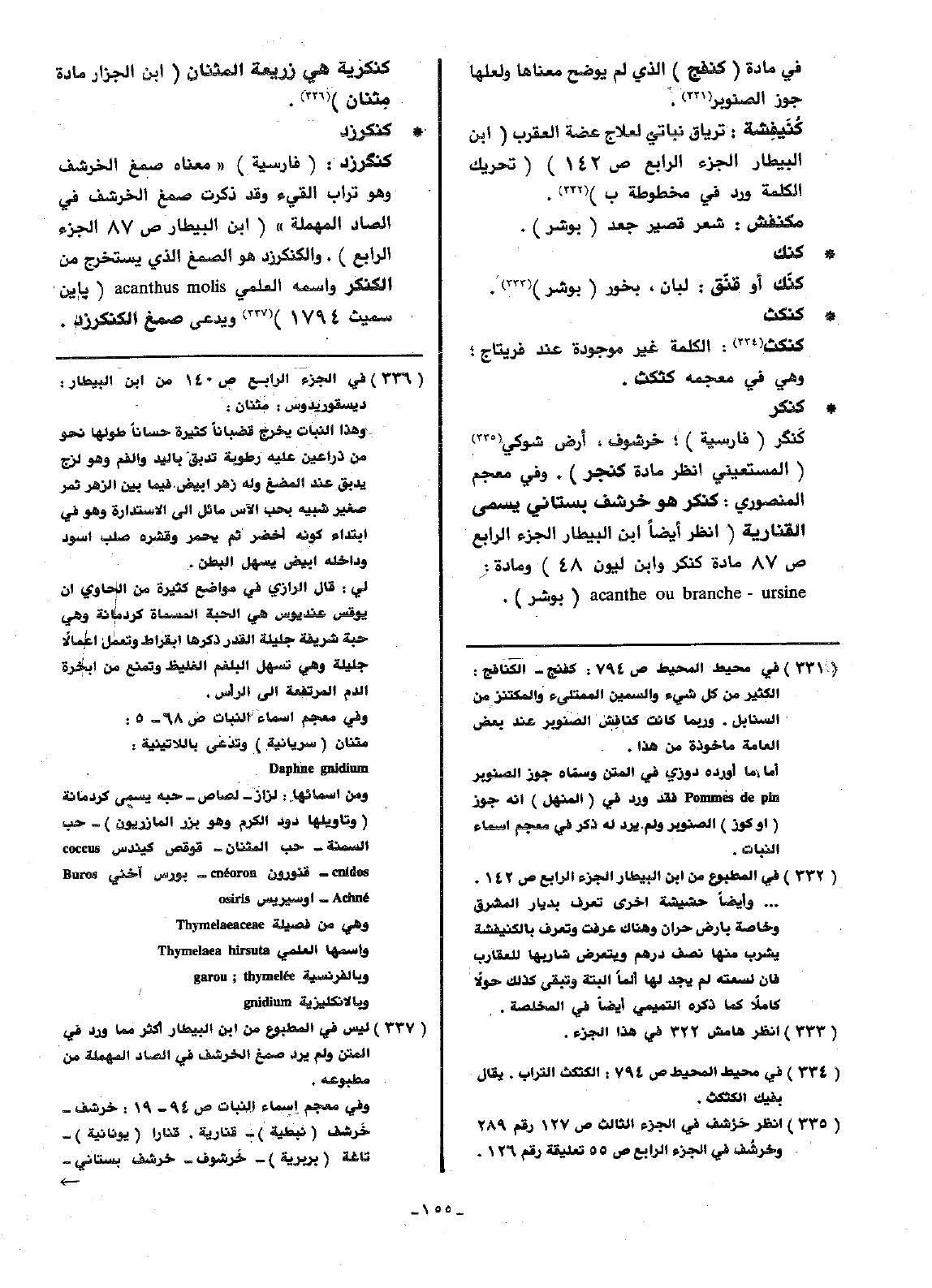 • كنكر: كَنكر (فارسية)؛ خرشوف، أرض شوكي (المستعيني انظر مادة كنجر). وفي معجم المنصوري: كنكر هو خرشف بستاني يسمى القنارية (انظر أيضاً ابن البيطار الجزء الرابع ص87 مادة كنكر وابن ليون 48) ومادة acanthe ou baranche- ursine ( بوشر).