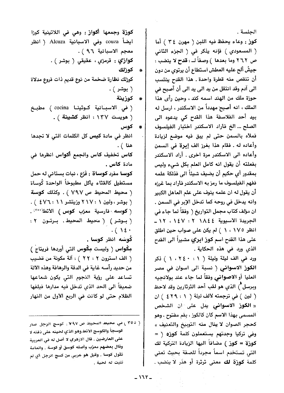 كوزة وجمعها أكواز: وهي في اللاتينية كوزا أيضاً couza وفي الأسبانية Alcuza ( انظر معجم الأسبانية 96).