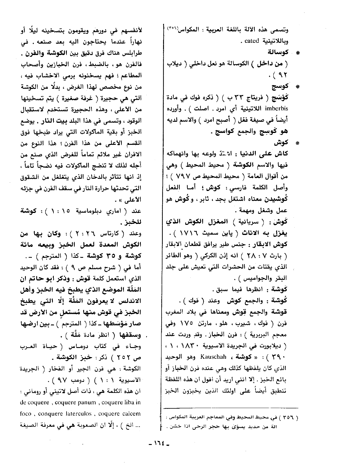 أما في (شرح مسلم ص9): فقد كان الوحيد الذي يستعمل كلمة قوش: وذكر أبو حاتم إن المَلّة الموضع الذي يطبخ فيه الخبز وأهل الأندلس لا يعرفون المَلّة إلاّ التي يطبخ صار مَوْسَطها -كذا (المترجم) - بين أرضها وسقفها (انظر مادة مَلَّة).
