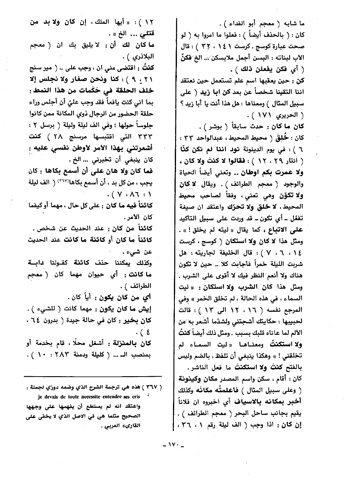 ومثل هذا كان الشرب ولا استكان: (ليت السماء، في هذه الحالة، لم تخلق الخمر). وفي المرجع نفسه (16، 12 إلى 13): قالت لحبيبها: حكايتك أشجتني ولشدّ ما أشعر به من الألم لما عاناه قلبك بسبب. ومثل ذلك أيضاً كنتُ ولا استكنتُ ومعناها (ليت السماء لم تخلقني) وهكذا ينبغي أن تلفظ، بالضم وليس بالفتح كنتَ ولا استكنتَ ما فعل الناشر.