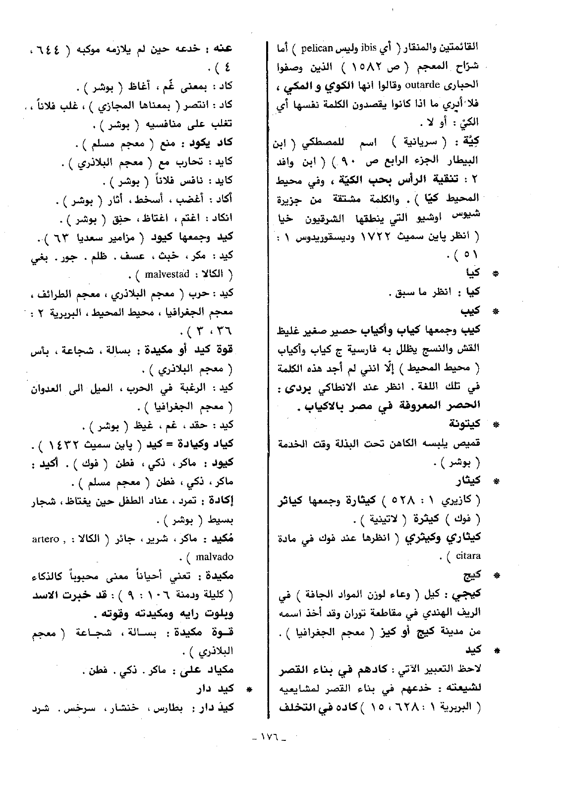 القائمتين والمنقار (أي ibis وليس pelican) أما شرّاح المعجم (ص1582) الذين وصفوا الحباري outarde وقالوا إنها الكوي فلا أدري ما إذا كانوا يقصدون الكلمة نفسها أي الكيْ: أو لا.