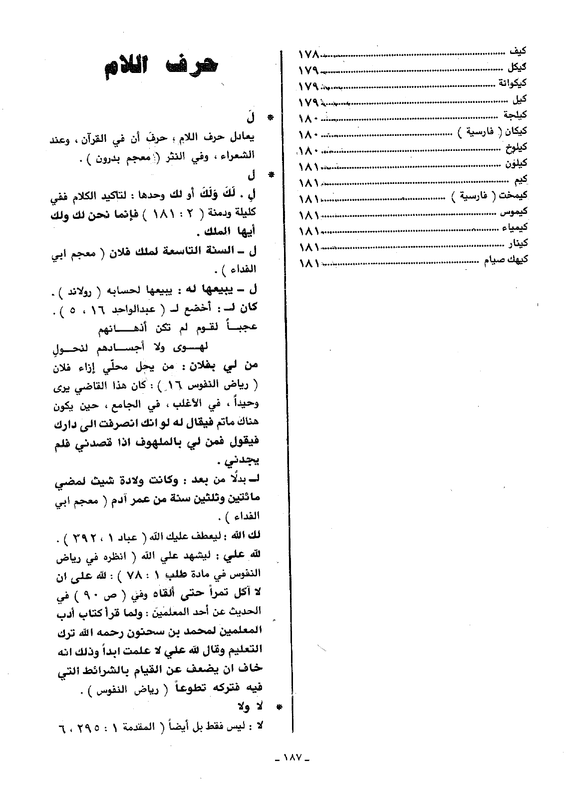 • ل: لِ. لَكَ وَلَك أو لك وحدها: لتأكيد الكلام ففي كليلة ودمنة (181:2) فإنما نحن لك ولك أيها الملك.