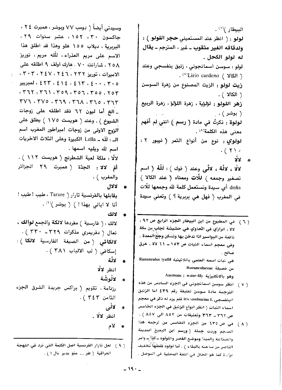 • لالك: لالك: (فارسية) مفردها لالكة والجمع لوالك، نعال (دفريمري مذكرات 329 - 330).